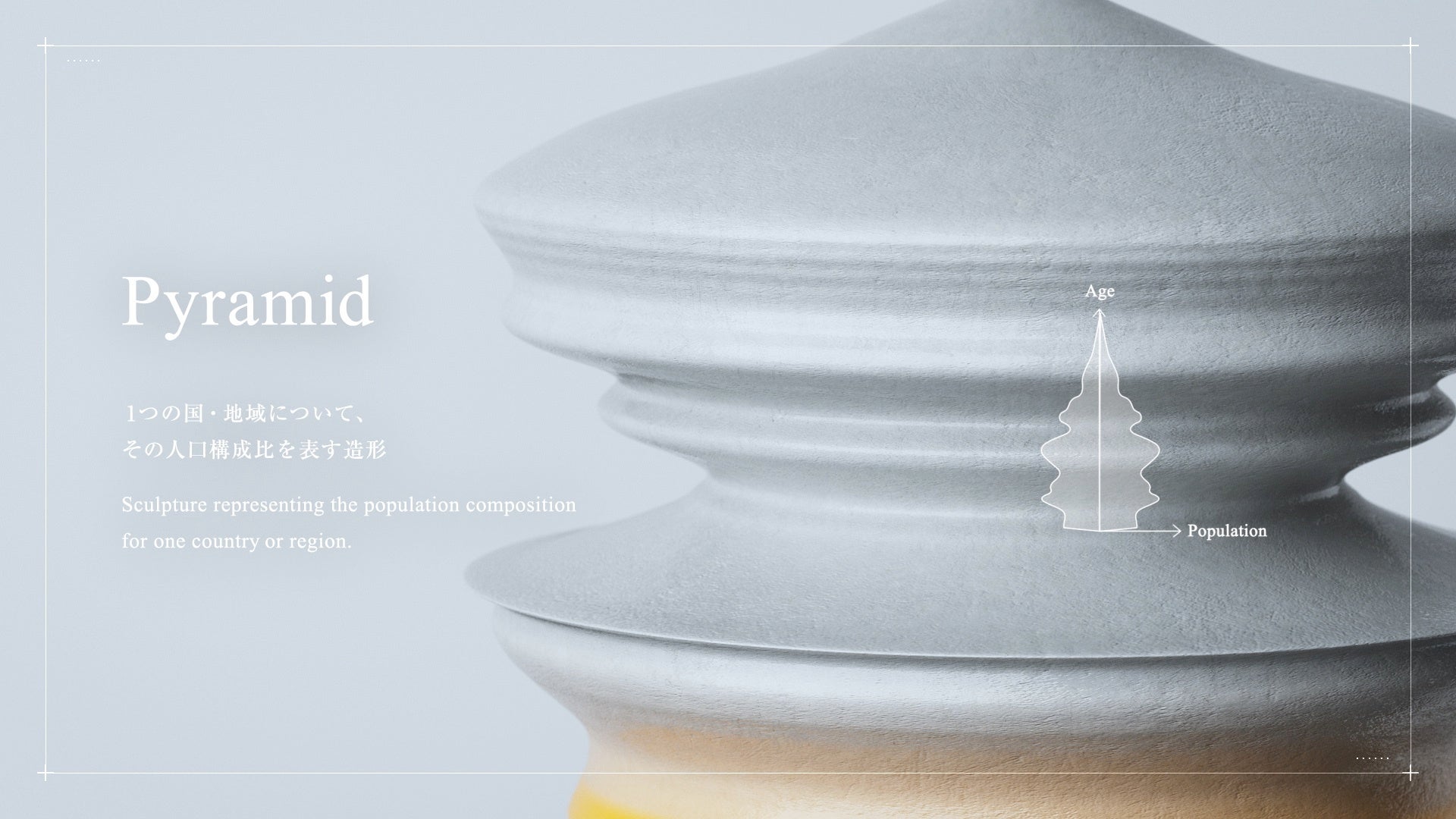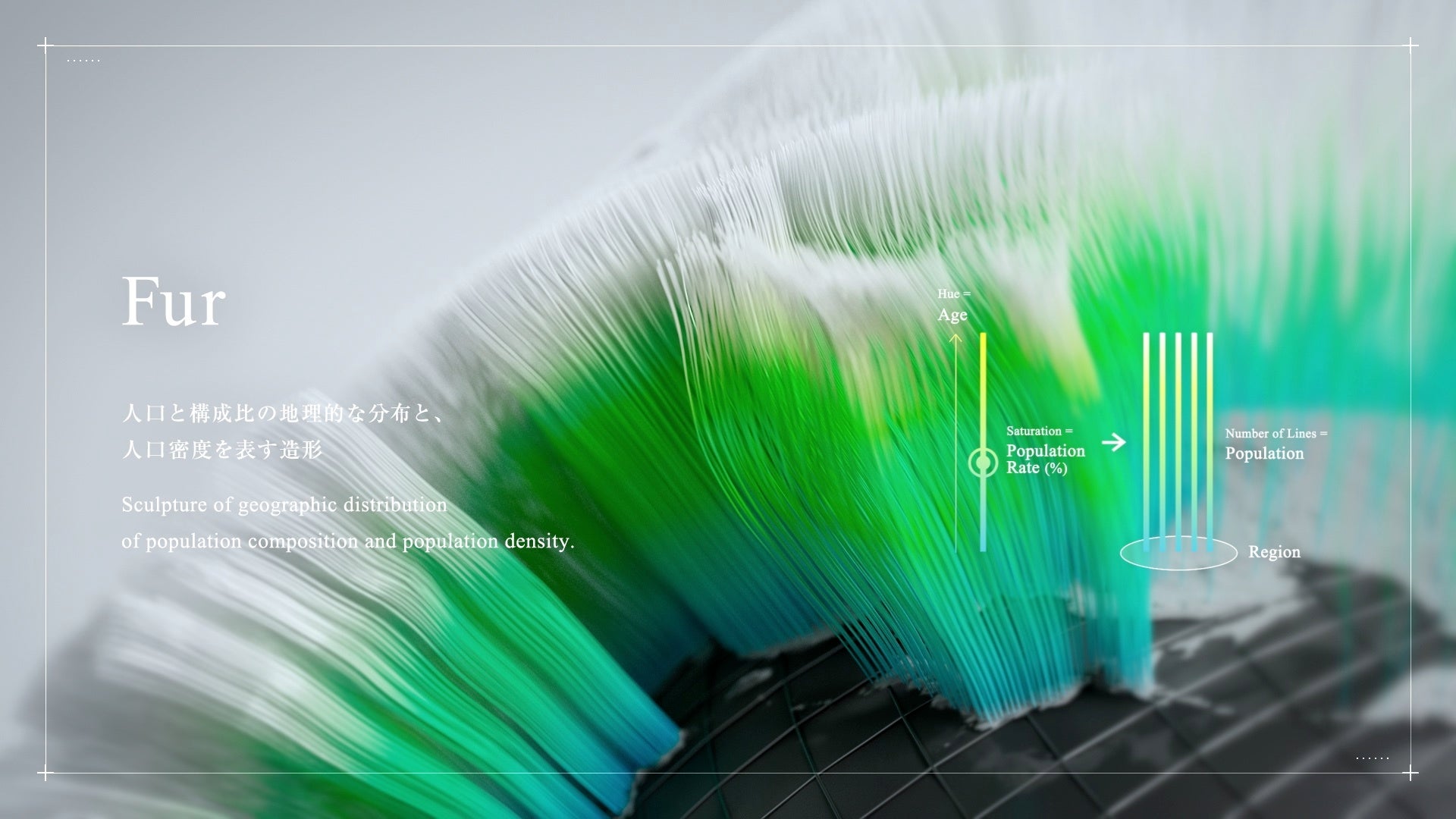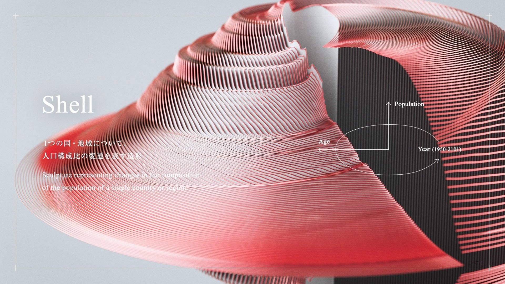 データを「造形要素」と捉えて、グラフ形状や座標軸の選択といった可視化における形状操作を、意図を排除した純粋な「造形」のプロセスに転換する。造形的な視点でデータの見え方を拡張することで、鑑賞者の創造性を湧き立て、問題に対する多面的な視点を与えることを目的とするデータ可視化手法。第一弾として、「世界の人口推移」を表現した。