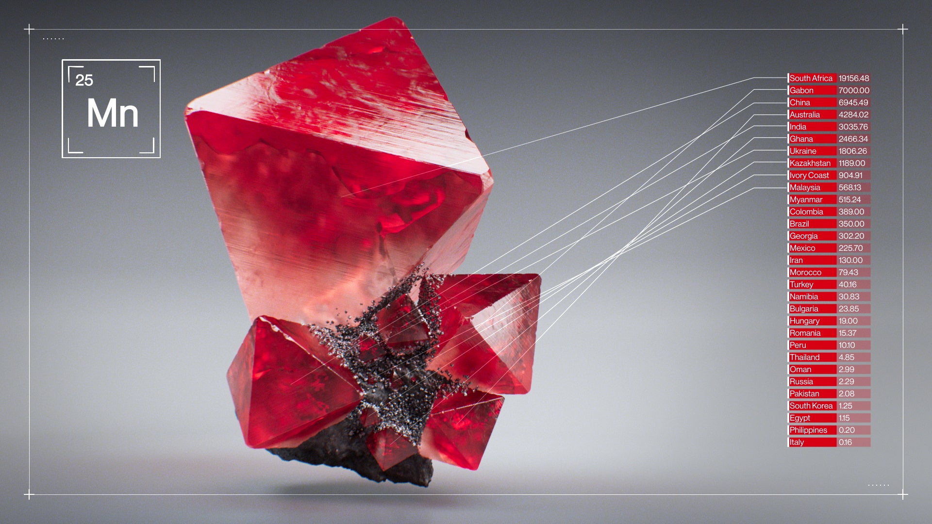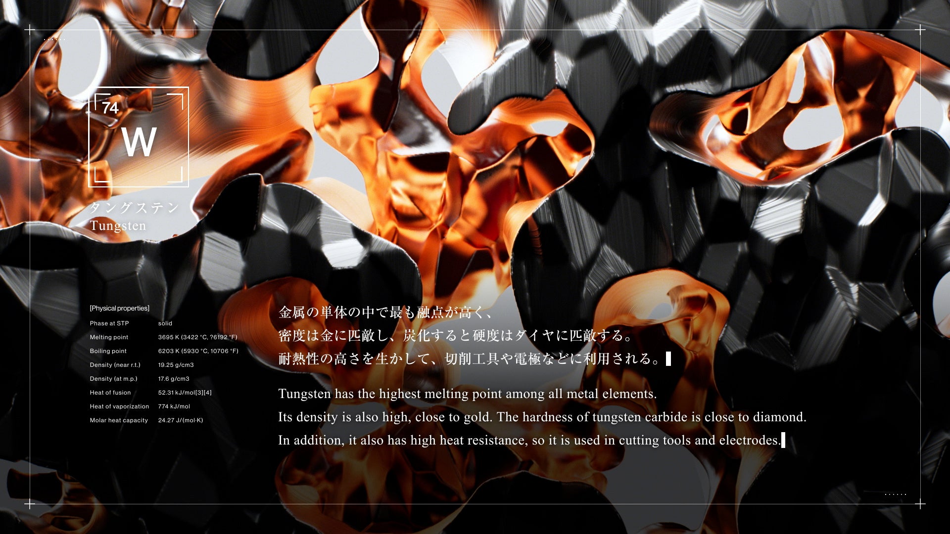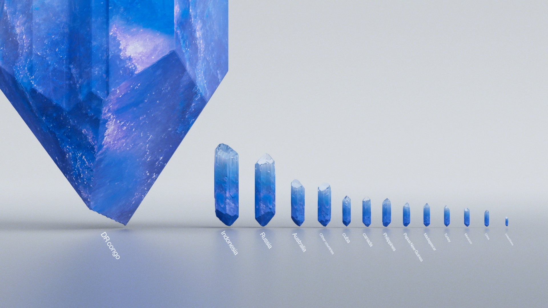データが現実世界で持っていた「質感」を、データ可視化の要素に取り込む。分布や変化、差異を伝えるというデータの基本的な機能は残しながら、文脈や背景、現実世界での物質性といった質的な情報も織り交ぜ、量的・質的な観点を1つの造形の中に捉えることを可能にするデータ可視化手法。第一弾として、「世界のレアメタル産出量」を表現した。