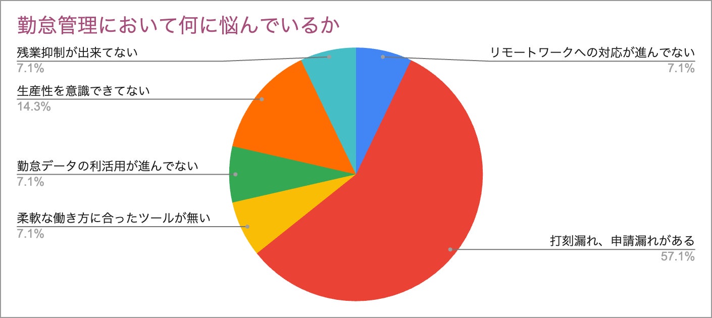 続いて、勤怠管理において何を悩んでいるかお伺いしたところ、圧倒的に打刻漏れ、申請漏れという結果になりました。