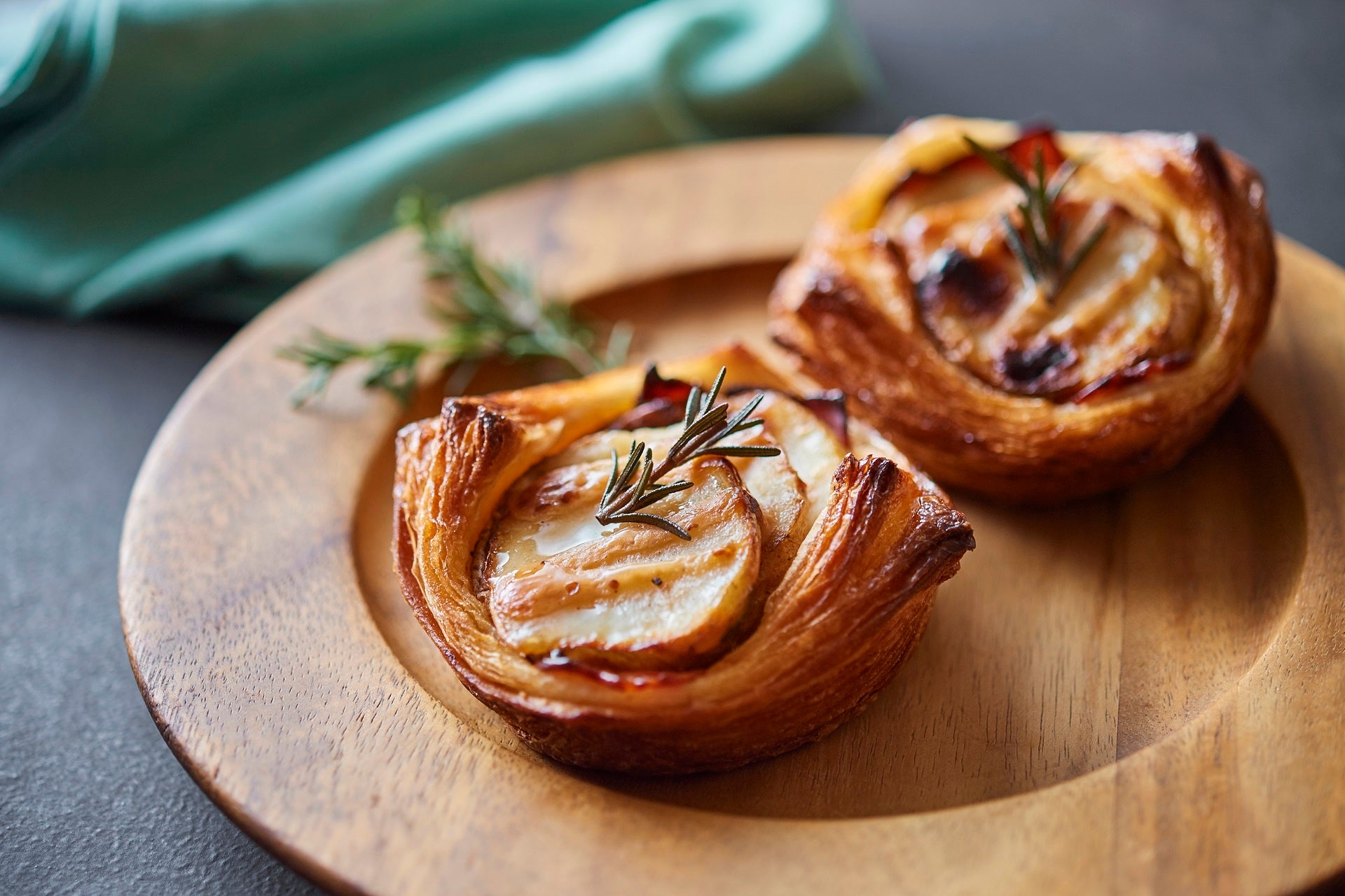 デンマークでよく食べられるじゃがいもをサレ系のデニッシュに。北海道産の皮付きじゃがいもとベーコンを重ね、マスタードソースを組み合わせました。