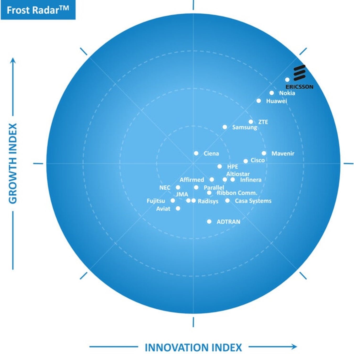 最新のFrost Radar™レポートでトップにランクされたエリクソンは、ビジネスコンサルティング会社のフロスト&サリバンによれば、5G無線アクセスネットワーク (RAN)、伝送ネットワーク、コアネットワークにまたがるネットワークインフラ市場において、イノベーションと成長の両面でリーダーとしての地位を獲得しています。