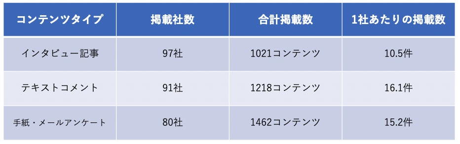 また、それぞれのコンテンツタイプ別に掲載コンテンツ数を調査した結果、インタビュー記事は1社あたり10.5件、テキストコメントは16.1件、手紙・メールアンケートは15.2件という統計が得られました。顧客との関係性を考えると、インタビュー記事は実施ハードルが高く、1社あたりの掲載数が少なくなる傾向があり、反対に実施ハードルが比較的低いテキストコメントを掲載している会社は、より多数のお客様の声を掲載している傾向にあります。