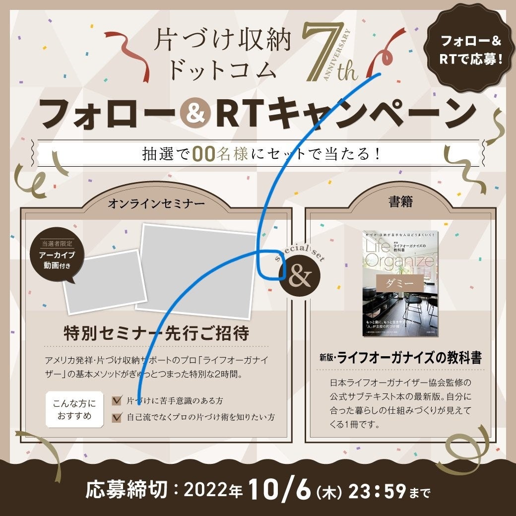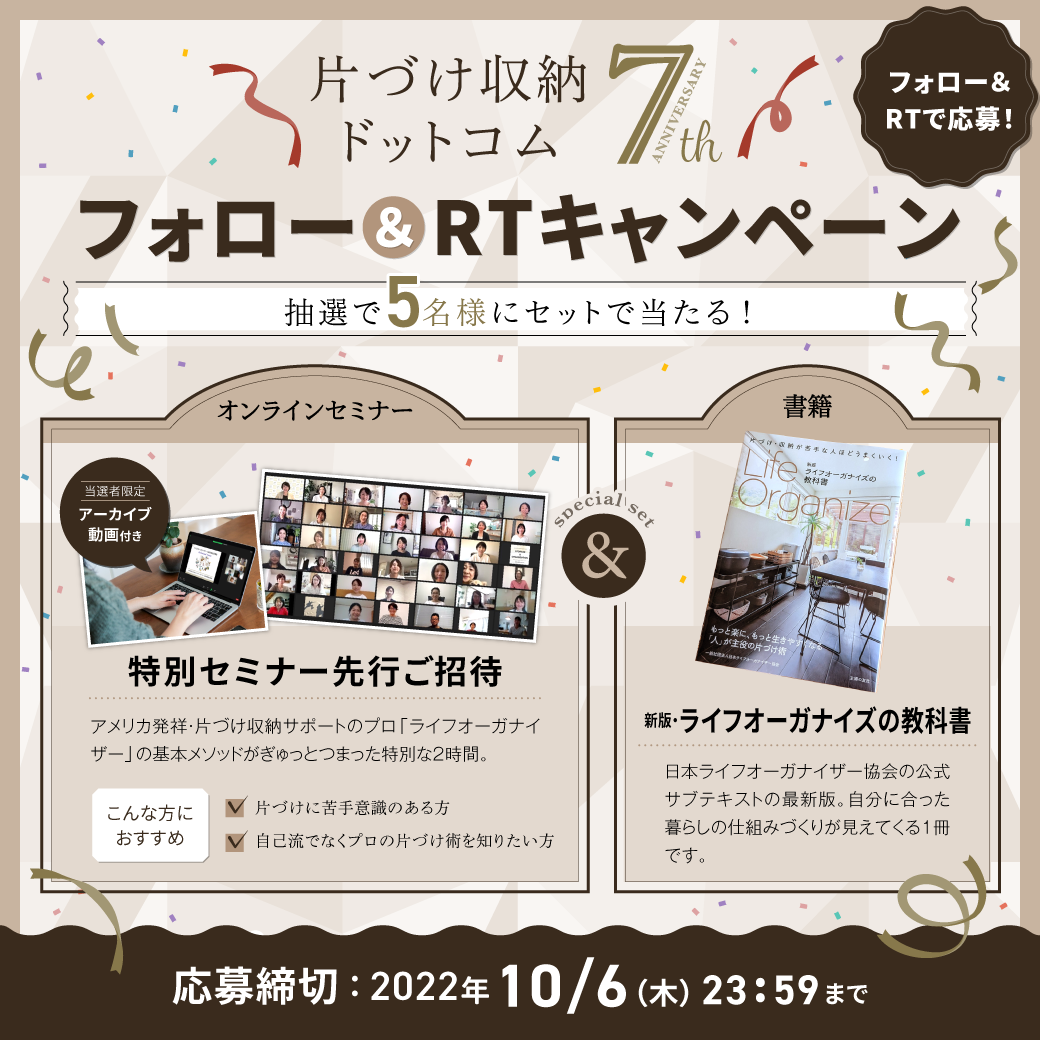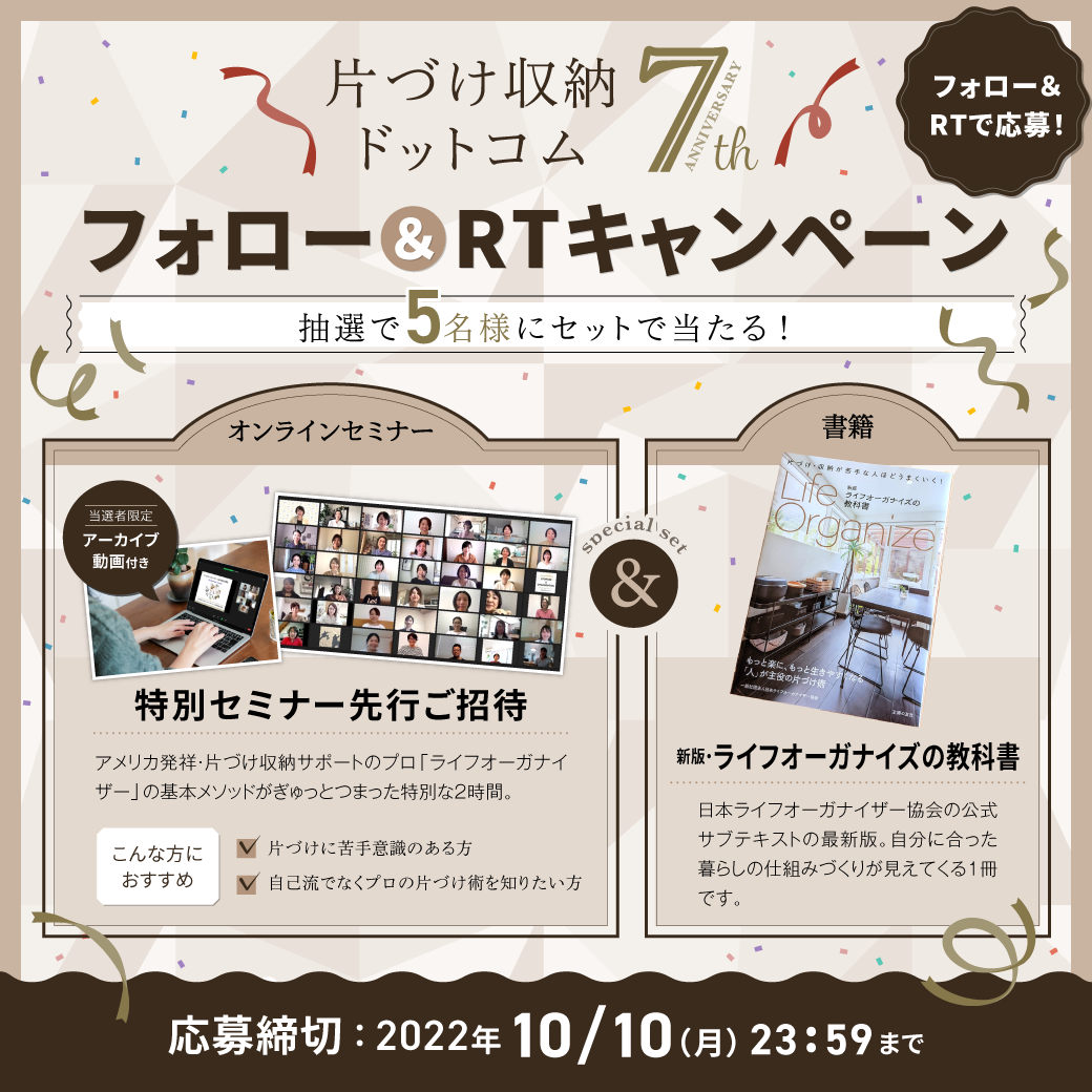 片づけ収納の専門家ライフオーガナイザーが知見を凝縮して発信するWEBマガジン「片づけ収納ドットコム」が7周年を迎えました。これを記念して、アメリカ発祥の片づけ「ライフオーガナイズ」の基本メソッドを学ぶことのできる特別イベントとSNSキャンペーンを開催いたします。