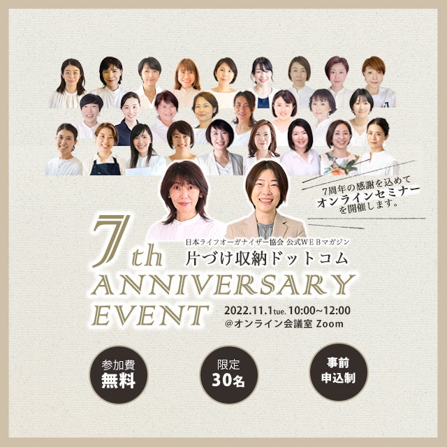 「片づけ収納ドットコム」開設7周年を記念し、日頃ご愛読くださっている読者の皆様と交流できる機会として、11月1日(火)にオンラインイベントを開催いたします。