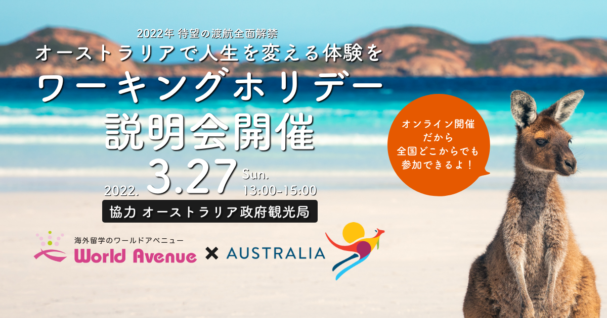 オーストラリアの観光産業にとって重要な国である日本からの観光需要回復に向けプロモーションを行っているオーストラリア政府観光局と、オーストラリアのワーキングホリデーを長年サポートしているワールドアベニューが協力し、長期間オーストラリアに滞在し働きながら観光が可能なワーキングホリデーのモニターキャンペーンの実施が決定致しました。