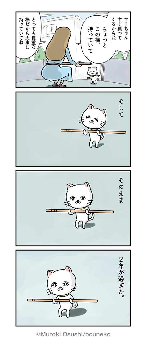 謎の棒を渡されたまま飼い主を失いとんでもない虚無顔だったフーちゃんは、突然の登場から1年半、およそ400話におよぶ4コマ漫画の世界の中で、棒を片時も離さず、仲間を作り、たくましく成長しました。