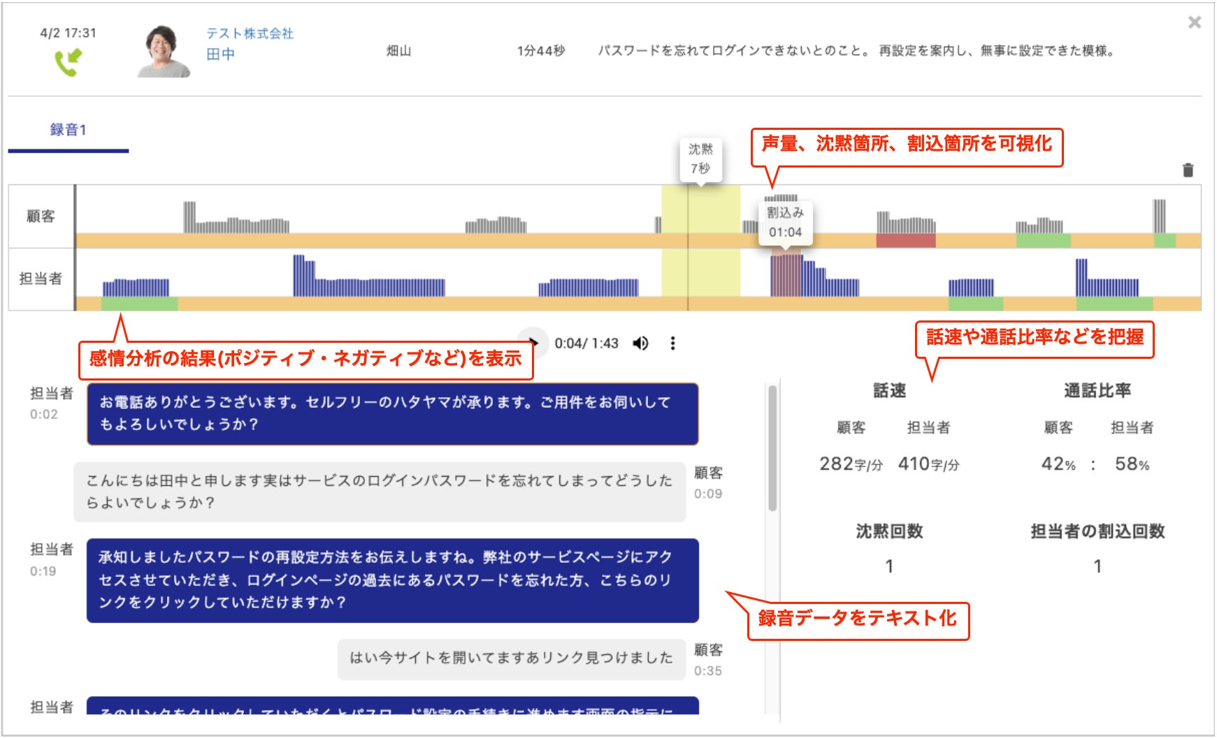 顧客と担当者がそれぞれ1分あたりに何文字話したかを測定し、表示します。