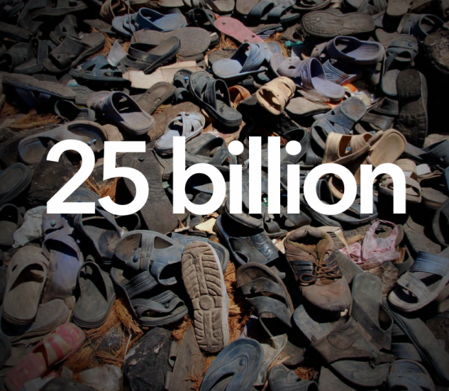 現在、世界では年間250億⾜以上の靴が流通しており、大半のスニーカーやサンダルは、靴底ソールに安価で軽い⽯油系素材・ビニル系素材を使用しております。これらの靴が履き古された後は、不燃ゴミとして埋め⽴て処理されることが主流となっておりますが、⽣分解性(※1)の低い素材で作られているため、土に還らず地中に残り続け、健康被害や地球温暖化の原因とも言われる温室効果ガスを放出するようになります。