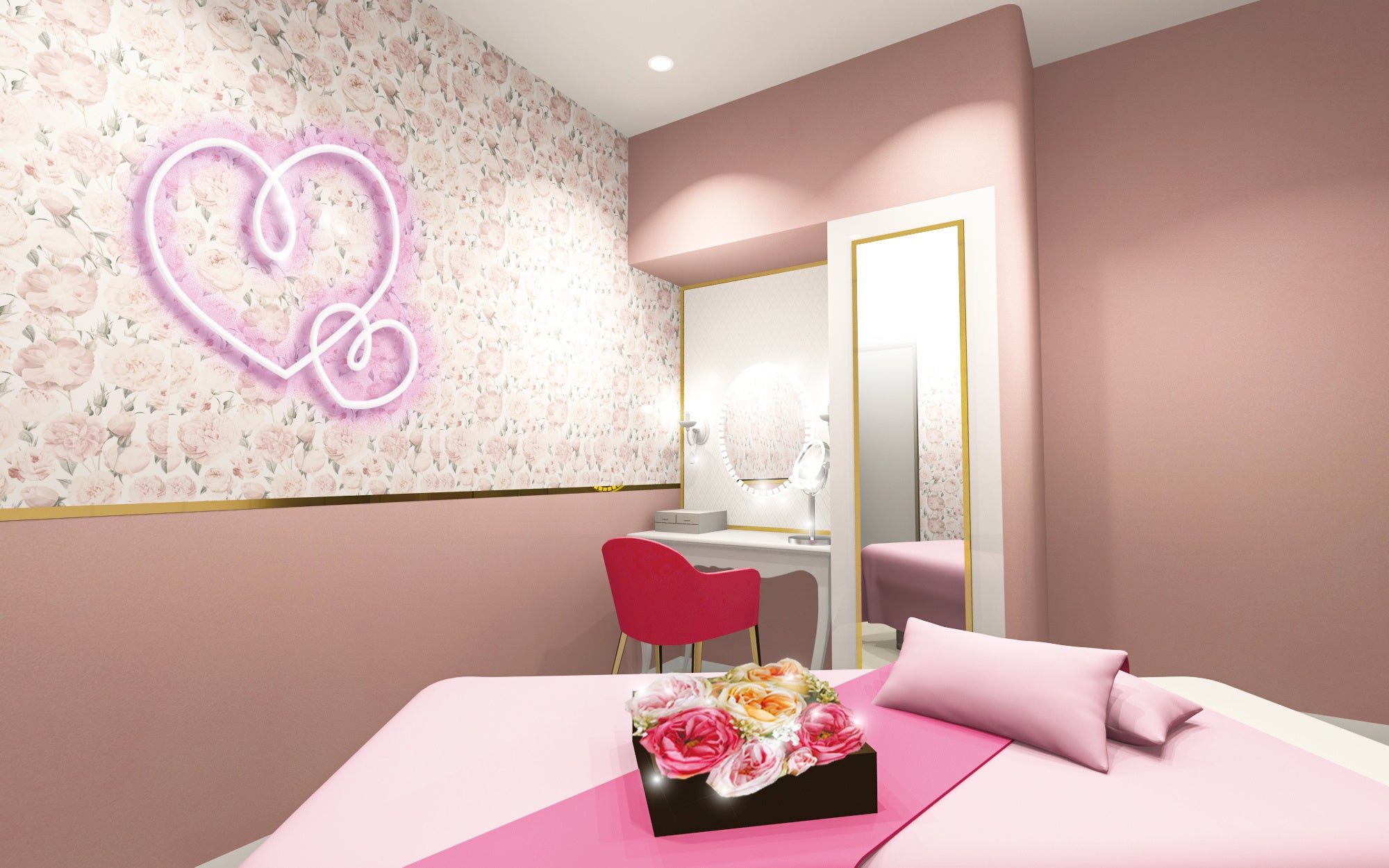 メインカラーは「Think Pink!」にちなみ、「幸せの色ピンク」を採用。インテリアには鮮やかなハートのネオンやエレガントなハンギングチェアなど、これからはじまる美と癒しの時間へ、期待を盛り上げる工夫が随所に凝らされています。トリートメントルームは全室ゆったりとおくつろぎいただける個室タイプを備え、さらにプライベート感を求める方のためにラグジュアリーなVIPルームもご用意いたしました。女性のお肌と心をときめかせるために誕生した新サロンで、“たかの友梨”が誇る珠玉のフェイシャル、ボディトリートメントを心ゆくまでお楽しみください。