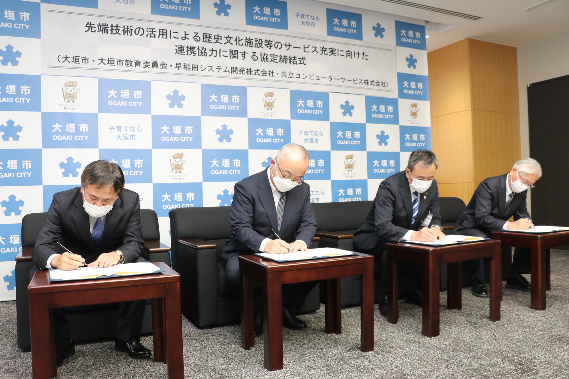 早稲田システム開発株式会社(東京都新宿区)は、このたび、岐阜県大垣市(石田 仁 市長)及び大垣市教育委員会(山本 譲 教育委員会教育長)、共立コンピューターサービス株式会社(岐阜県大垣市)と、『先端技術の活用による歴史文化施設等のサービス充実に向けた連携協力』に関する協定を結びました。本協定は、ICT(情報通信技術)等の先端技術の活用を加速する大垣市が、市内の歴史文化施設等(※1)における展示ガイダンスシステムの構築・運用を通じて市民サービスのさらなる充実を図るもので、令和3年12月22日、大垣市役所にて締結式が行われました。当社は、ミュージアム展示ガイドアプリ『ポケット学芸員』(※2)を提供します。