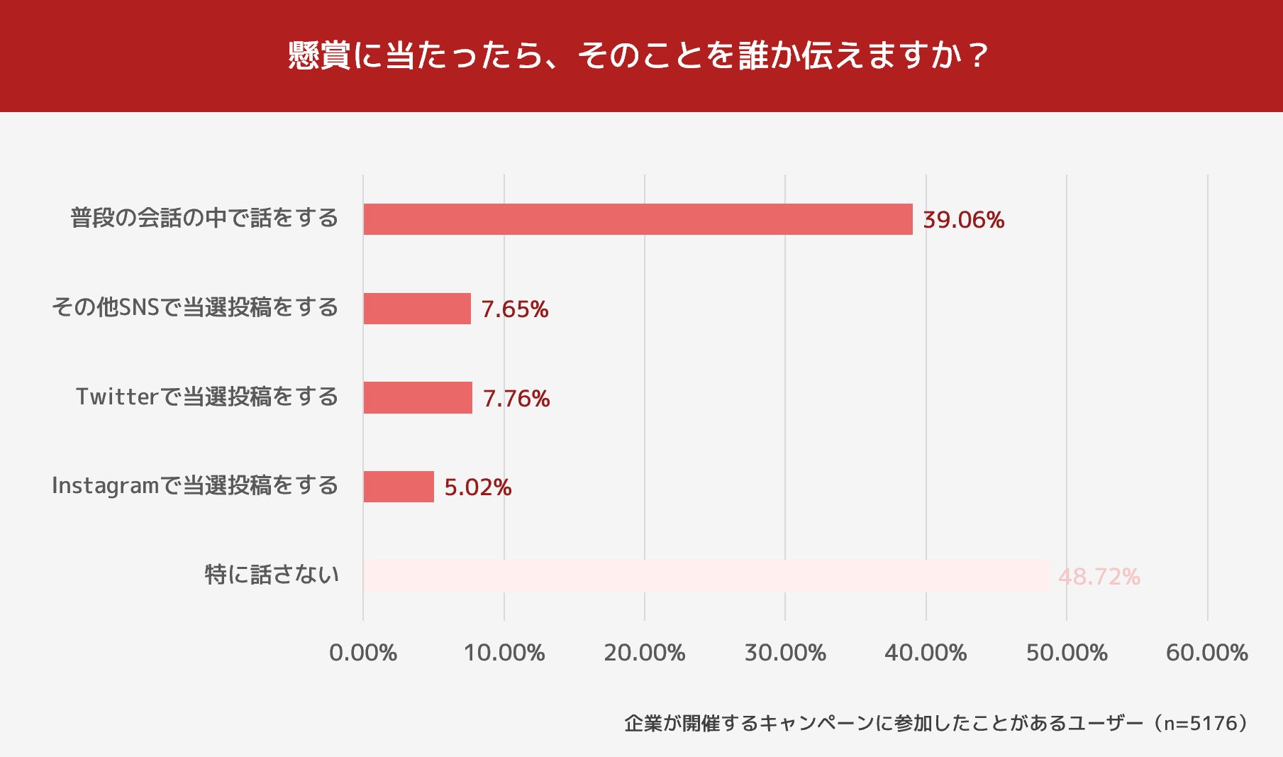 参加したキャンペーンに当選した場合、誰かにそのことを伝えるか?というアンケートを実施したところ、半数以上が「誰かに伝える」という回答でした。