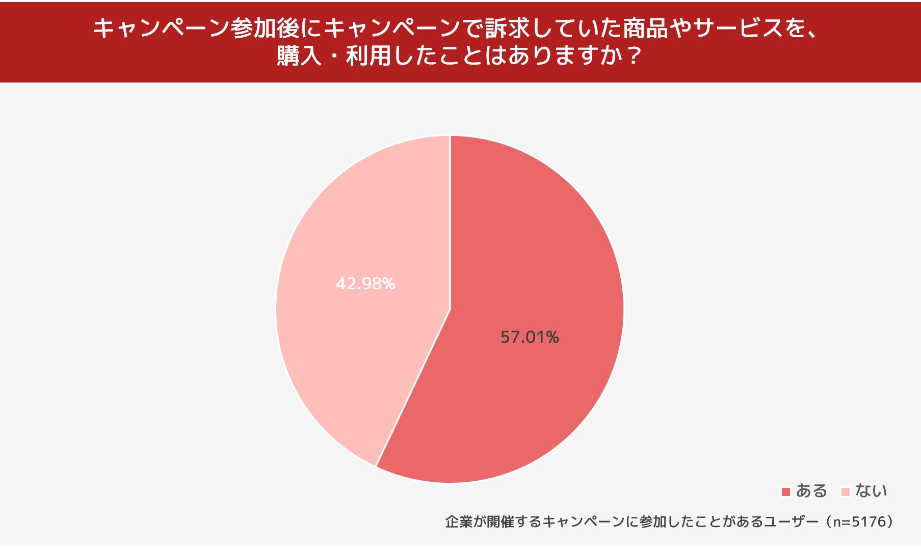 キャンペーン参加後に、PRされていた商品・サービスの購入・利用経験についてアンケートを行ったところ、「購入・利用経験 あり」と回答された方が、57%と約6割となりました。商品・サービスの購入・利用獲得の手段として、キャンペーンは有効であると言えます。