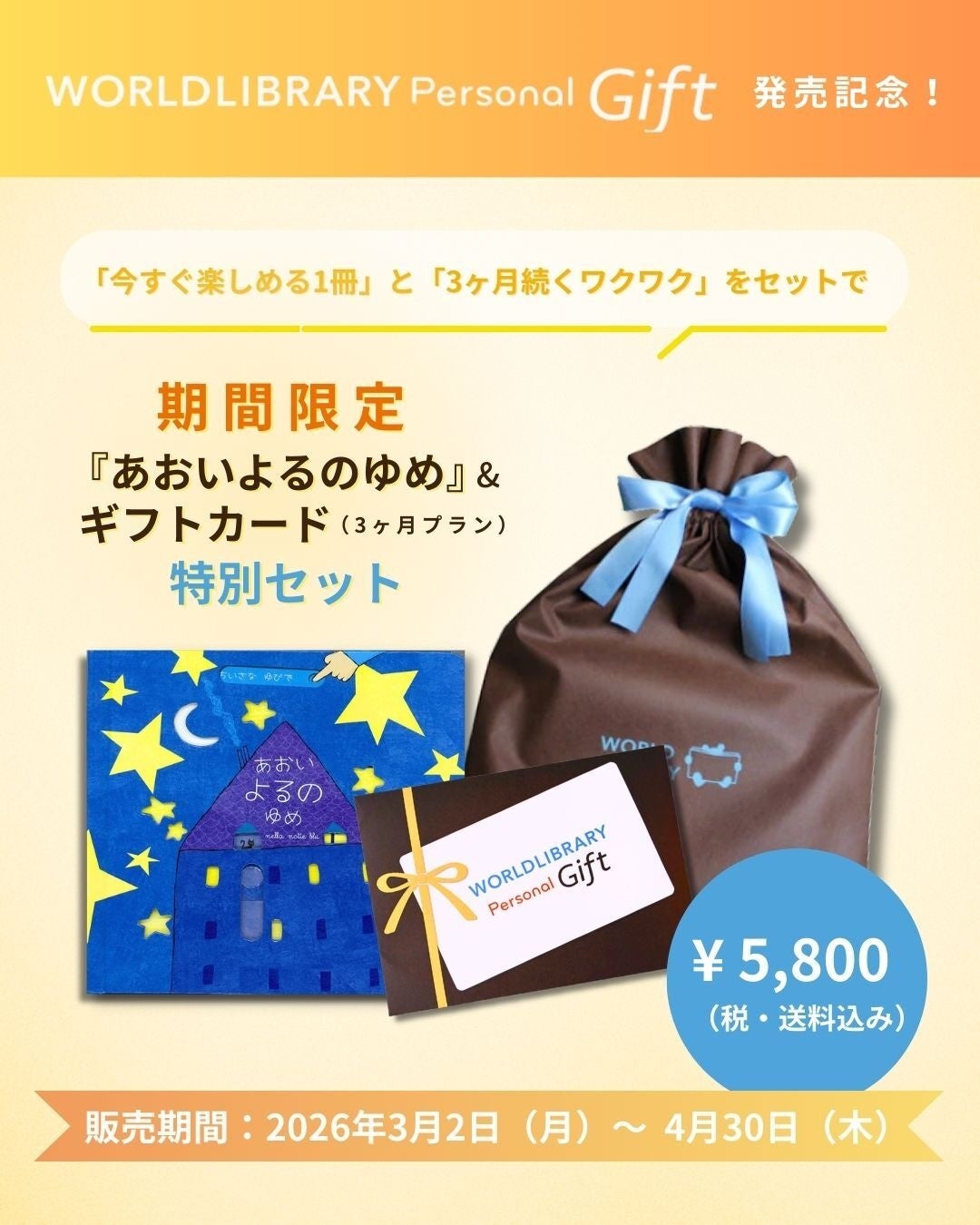 ワールドライブラリー大人気しかけ絵本『あおいよるのゆめ』とギフトカード(3ヶ月プラン)がセットになった、ギフト商品です。
