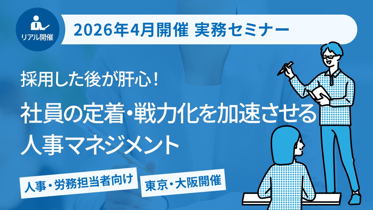 株式会社エヌ・ジェイ・ハイ・テック(本社:大阪市中央区、代表取締役:吉田啓二)は、中小企業の人事・労務担当者向け実務セミナー「採用した後が肝心! 社員の定着・戦力化を加速させる人事マネジメント」を東京で4/15(水)、大阪で4/24(金)に開催いたします。