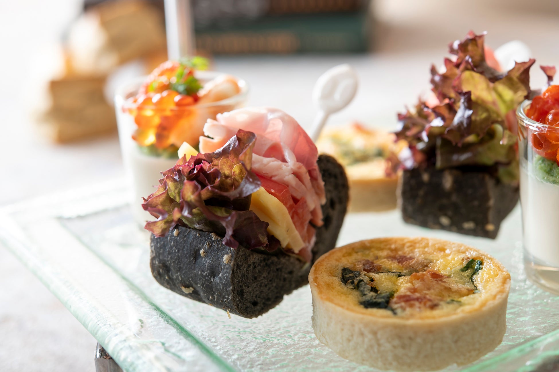 セイボリーには、日本を代表して当ホテル発祥のメニューをラインナップ。1991年の開業当初から人気を誇る元祖「イカスミパン」を使ったサンドウィッチ “コーザノストラ” は、当ホテルのシェフが考案した世界のインターコンチネンタルホテルでも愛される逸品。パルメザンチーズの香ばしい香りが立ちのぼる、インパクトのある「イカスミパン」は開業以来愛され続ける味わいです。神奈川県産の旬の野菜を使ったキッシュやムースなども彩りを添えます。