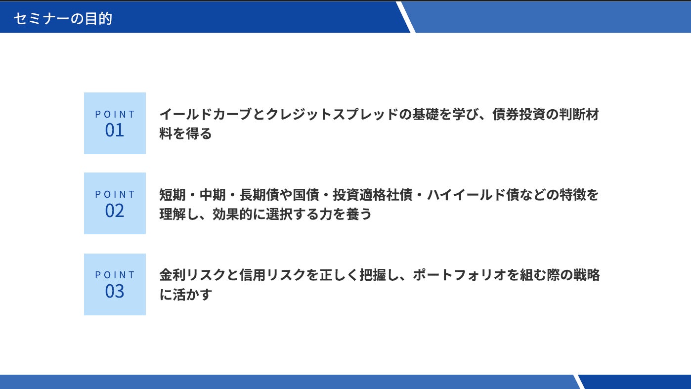 本セミナーでは、債券の基本的知識から金利の構成要素などを踏まえた上で、