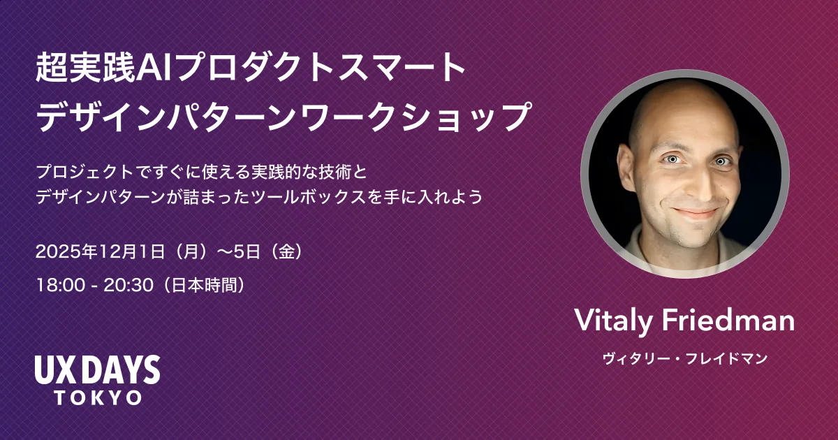 UX DAYS TOKYO(主催:Web Directions East合同会社 東京品川区、代表:菊池聡)は、世界最d大級のウェブデザインメディア「Smashing Magazine」の創設者・編集長であるVitaly Friedman(ヴィタリー・フリードマン)氏を講師に迎え、特別オンラインワークショップ「AIスマートデザインパターン:AI時代のプロダクト体験設計」を2025年12月1日(月)〜5日(金)に開催いたします。ChatGPT以降、「AIにインターフェイスは不要」という考えが広がっていますが、シリコンバレーを中心として実際にはユーザーの曖昧な意図を正しく理解し支援するスマートなUI設計こそが、AIプロダクト成功の鍵であることがAmazonなどの世界の事例から明らかになっています。
