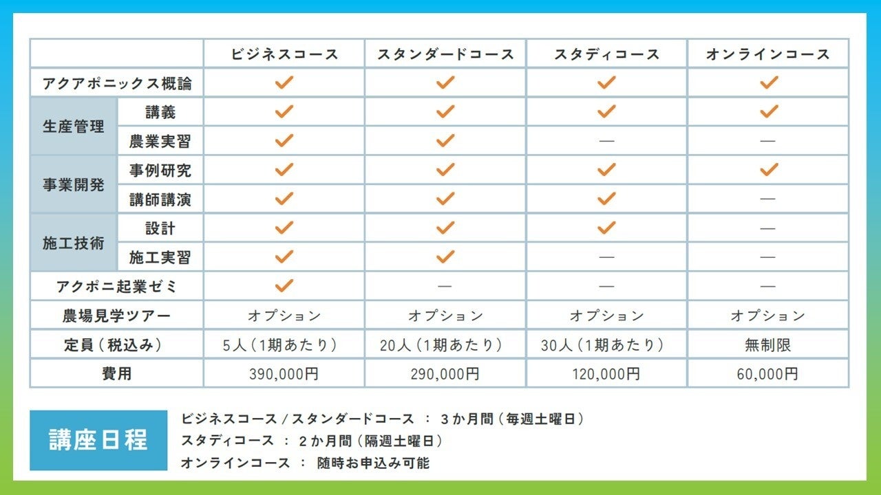 新規事業や農福連携の取り組みとしての導入をはじめ、就農や起業のツール、家庭菜園としての活用など、企業から個人まで幅広くアクアポニックスに取り組んでいただくために、選べる4コースを提供。会場に通学して受講する「ビジネス」「スタンダード」「スタディ」コース、動画を視聴して学ぶ「オンライン」コースを開講します。