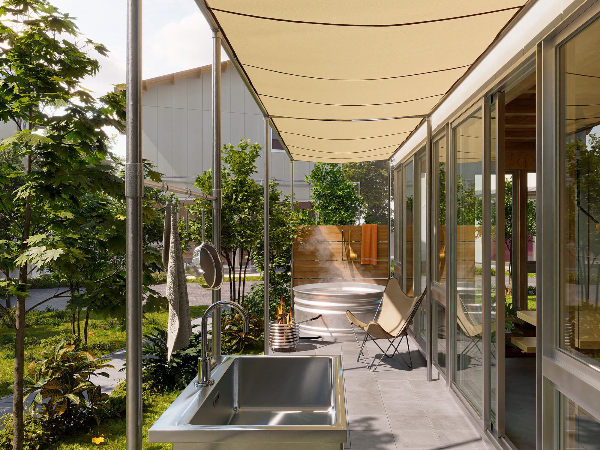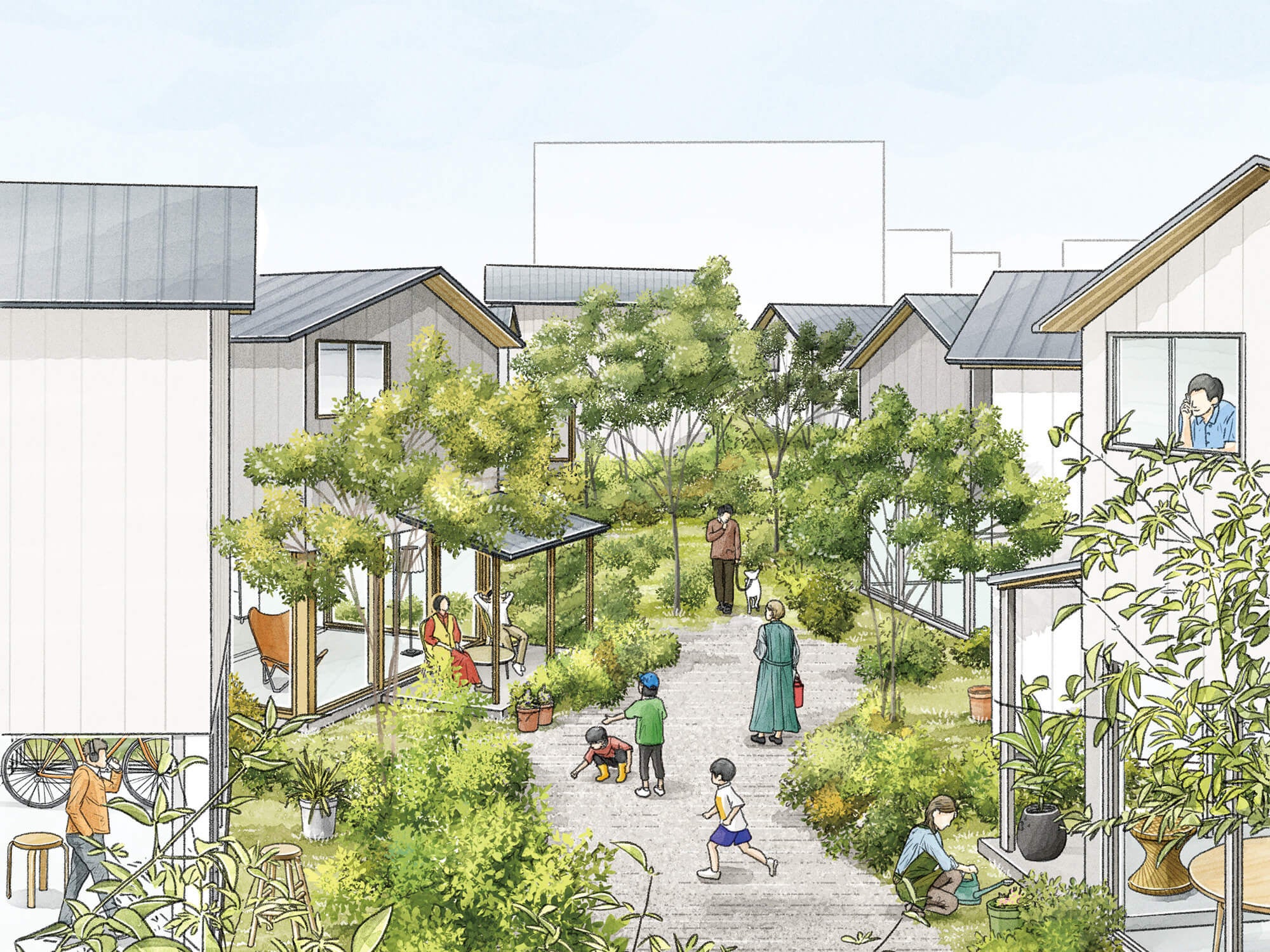 区画の境を、塀や柵ではなく植栽でゆるやかに区切ることで、連続的な緑の風景を生み出し、ひとつの家では得られない豊かな環境をつくります。