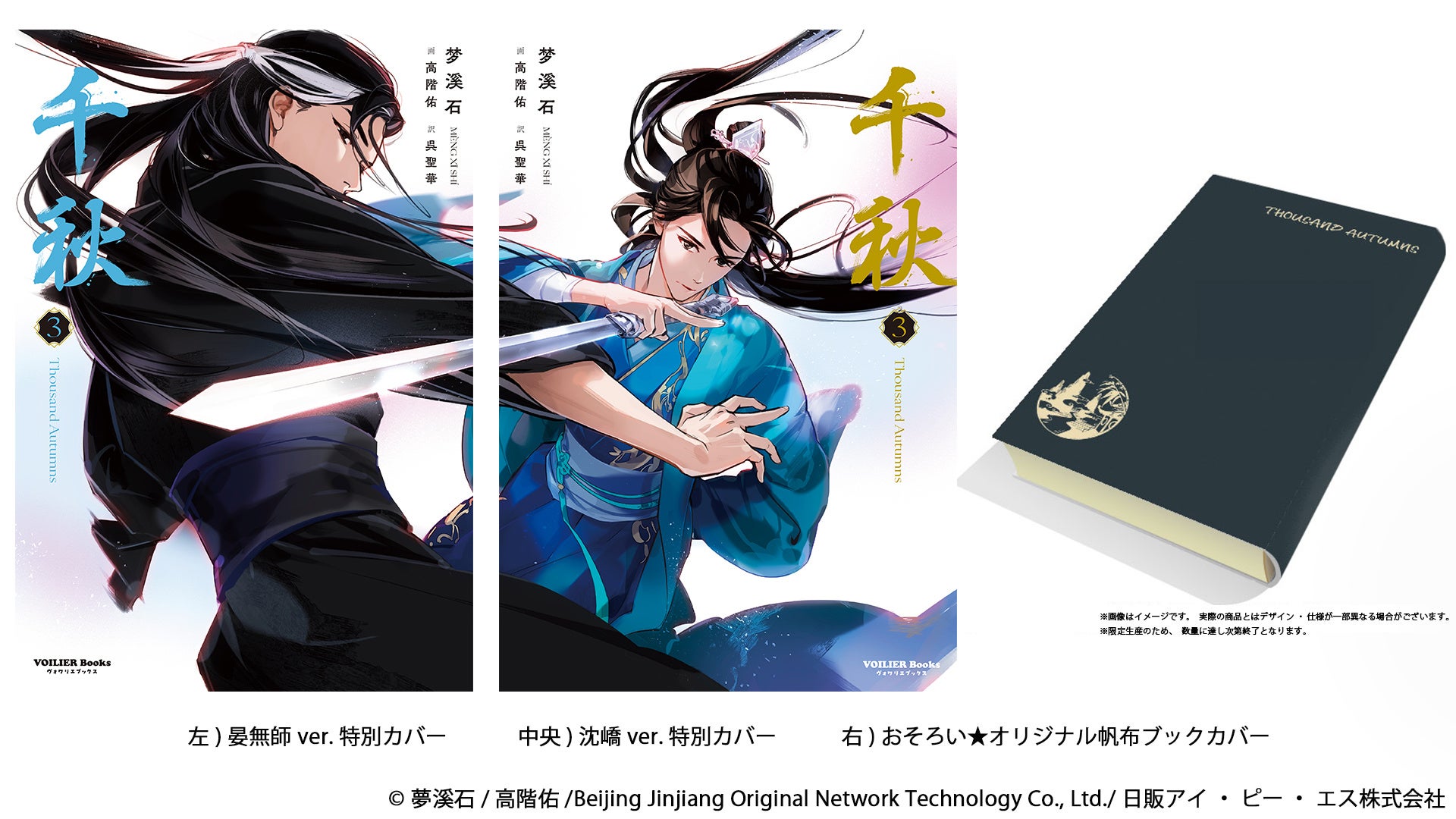 日販アイ・ピー・エス株式会社(本社:東京都文京区、代表取締役社長:佐藤 弘志)は、企画・運営する出版レーベル「ヴォワリエブックス( https://www.nippan-ips.co.jp/voilierbooks/ )」より2024年10月29日(火)に発売する、長編中華BL『千秋(せんしゅう)』日本語版第3巻*の特別カバー「晏無師(イエンウースー)ver.」「沈嶠(シェンチアオ)ver.」2種を、本日2024年8月22日(木)より一部の書店にて予約受付を開始します。*全4巻、順次発売予定