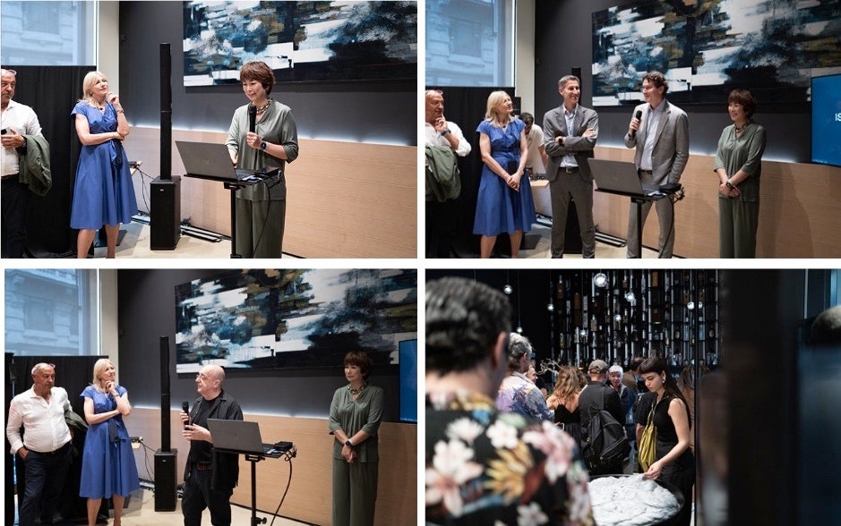 レセプションパーティーはミラノ中心街の創作日本料理店Wicky's(ウィッキーズ)で開催されました。当社代表取締役社長 阪根利子がプラチナウール™について、開発経緯などをふまえた詳細説明を行ったのをはじめ、CM Tessuti社のクリスチャン氏やデザイナーのリカルド・ラミ氏によるスピーチも行われました。またレセプションの開催に至ってはウールマークカンパニーの多大なる協力も頂きました。