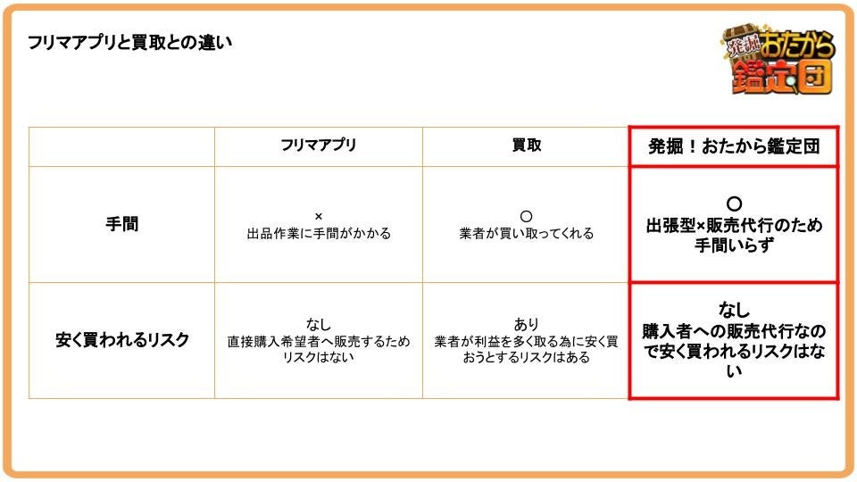 「発掘!おたから鑑定団」は、ご自身で出品作業(商品の撮影、交渉手続き、梱包・発送作業など)を実施するフリマアプリと、一度商品を買取った後に再販を行う買取業者の、中間的な立ち位置と捉えています。