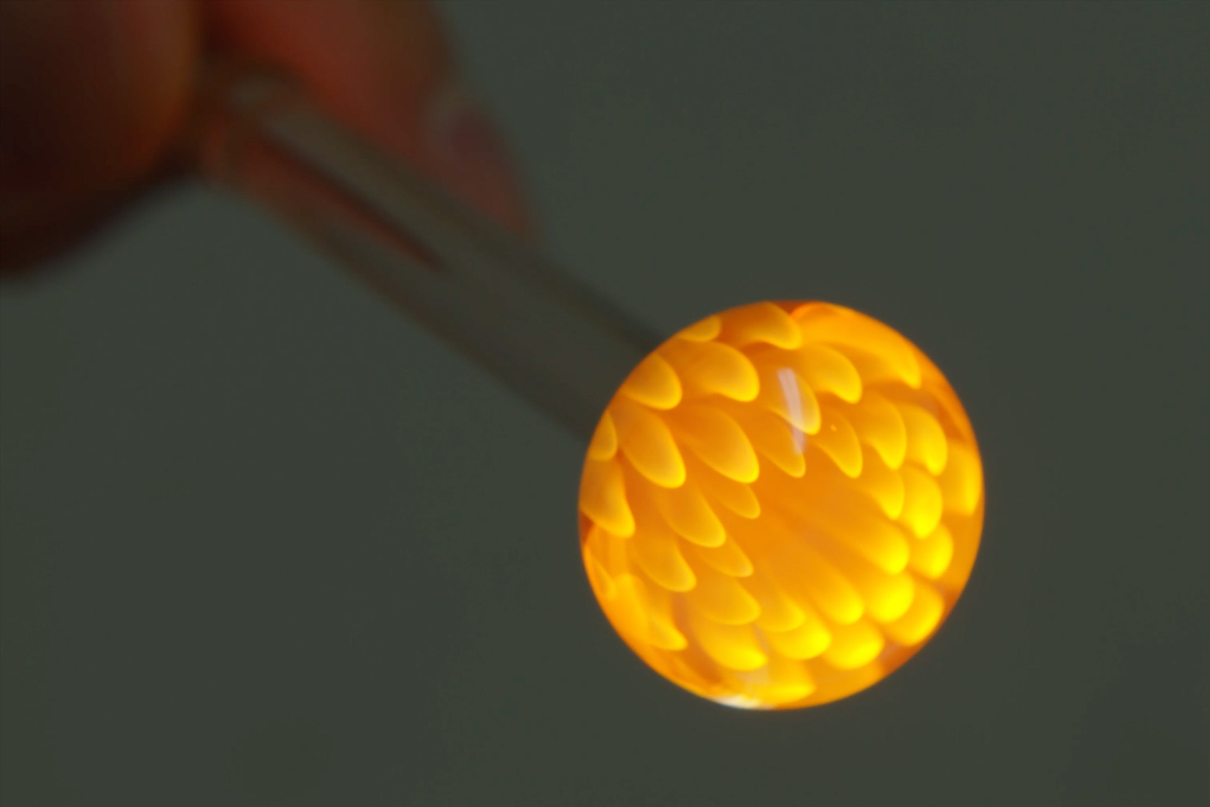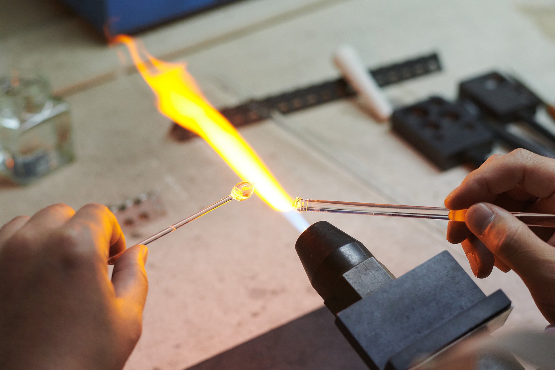 使用しているガラスはホウケイ酸ガラスと呼ばれる世界的にも有名な耐熱性ガラスです。耐熱性なので熱に強く割れにくいのが特徴で、さらに軽くて透明度が高いガラスとしても知られています。バーナーの熱加減や特殊な技術を駆使しながら生まれる細かい模様は、ガラスの中に神秘的な世界を作り上げます。