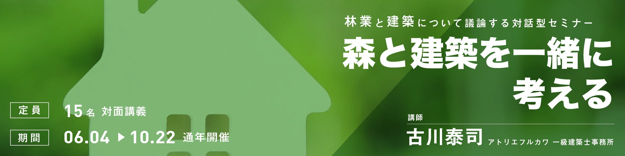 本講座は、「森と建築を一緒に考える」をメインテーマに、これまで数多くの住宅・非住宅の木造建築を手掛けられてきた古川氏と参加者が全10回にわたり、木材建築について多角的な視点でディスカッションしていく対話型のイベントとなります。