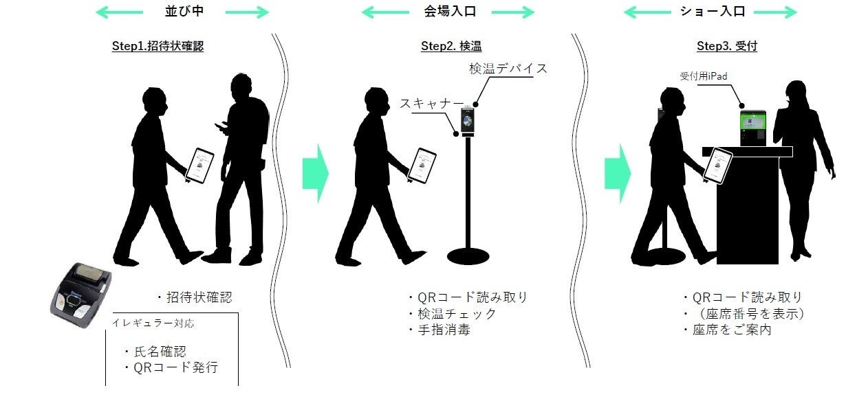 また、感染症対策となる非接触受付に対応したショー当日の入場管理以外にも、ローンチメトリックスのイベント管理機能に含まれる来場者の出欠オンライン管理(来場者リストの作成、招待メールの作成と配信、出欠回答の確認等)や来場者のシーティング管理(シーティングマップの作成、来場予定者の座席配置、QRコード付きシーティングナンバーメールの配信等)を行うことができ、グローバル基準による来場者・関係者にスムーズな入場体験を提供します。