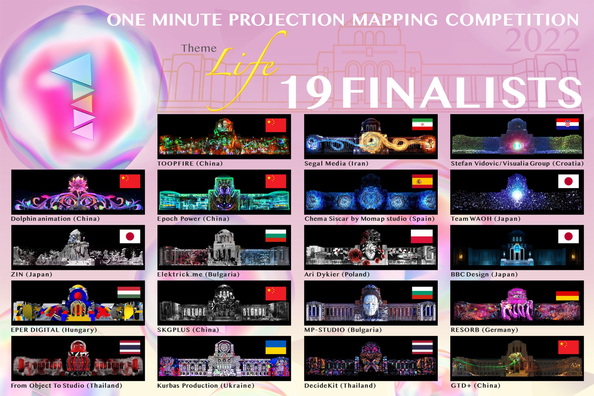 1minute Projection Mapping Competitionは世界各国から集まるハイレベルで個性豊かな作品を、同じ会場で一度に見ることができる、唯一無二のプロジェクションマッピング国際大会です。毎回異なる制作テーマと、1分台という短いプロジェクションマッピング作品で世界一の称号と優勝賞金200万円を競います。
