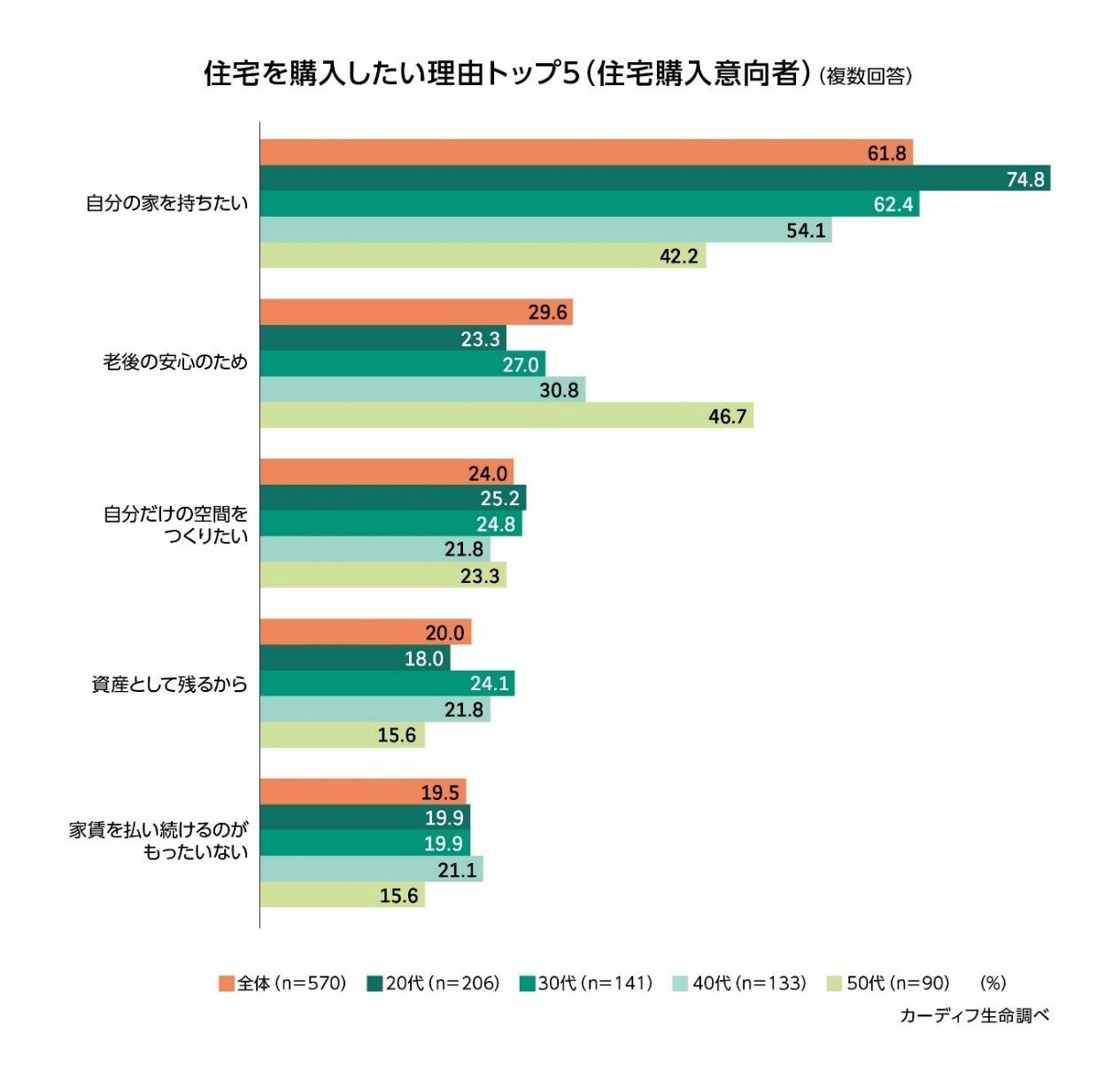 - 住宅を購入したい理由は、「自分の家を持ちたいから」がトップの62%(昨年比+5.3pt)で、2年連続して上昇した。世代別にみると、20代75%(全体平均比+13.0pt)、30代62%(同+0.6pt)、40代54%(同-7.7pt)、50代42%(同-19.6pt)と20代が最も高かった(図表6)。そのほかの特徴として、「趣味を追求するための空間がほしい」19%(同+2.7pt)、「ローンを組めるうちに購入したい」9%(同+0.5pt)、「賃貸で借り続けられないと思う」7%(同+0.4pt)と回答した人も年々上昇している。