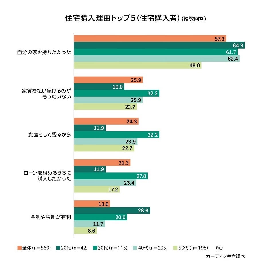 - 住宅を購入した人の購入理由では、「自分の家を持ちたかった」57%(昨年比+3.2pt)、次いで「家賃を払い続けるのがもったいない」26%(同+0.3pt)、「資産として残るから」24%(同+2.7pt)、「ローンを組めるうちに購入したい」21%(同+5.6pt)(図表4)。特に30代では、「資産として残るから」32%(昨年比+11.8pt)、「ローンを組めるうちに購入したかった」28%(同+13.2pt)、「金利や税制などが有利で買い時だと思った」20%(同+8.3pt)と、マネーへの意識の高まりがうかがえる。