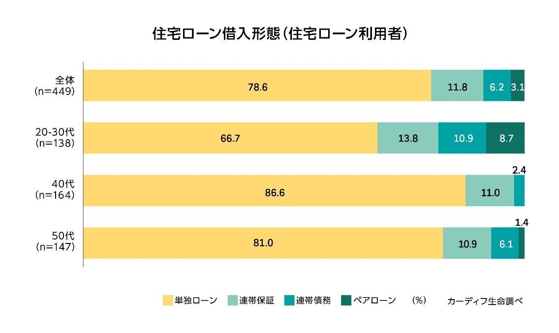 - 一方、20~30代では「単独ローン」は67%にとどまり、パートナーなどとの収入合算が3割強を占めた(「連帯保証※8」14%、「連帯債務※9」11%、「ペアローン※10」9%)。