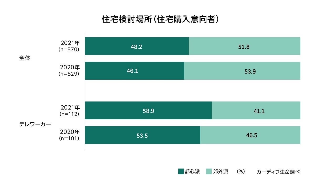 - 住宅購入の検討場所、「都心派」と「郊外派」が拮抗。テレワーカーは利便性を求めて都心志向が高まる