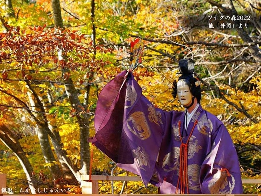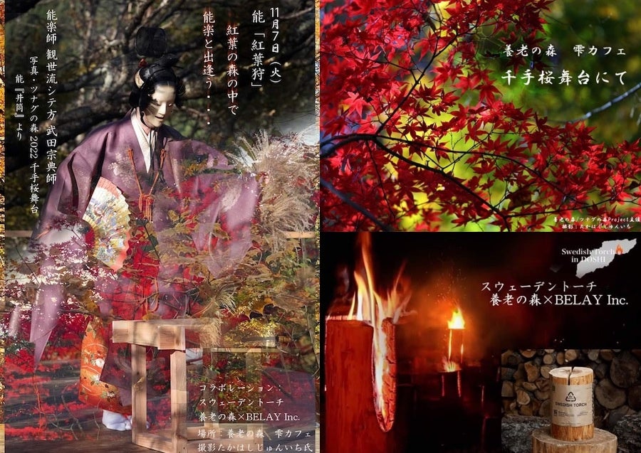 の森・雫カフェ)が2023年11⽉7⽇(⽕)・11⽉8⽇(⽔)に開催されます。11月7日(火)は、能面をかけ装束をつけた武田宗典師氏ほか、御三方での能「紅葉狩」ダイジェストの舞台。養⽼の森の間伐材を利⽤して作られたスウェーデントーチの灯⽕で演出します。能楽鑑賞の前には古民家にて能「紅葉狩」レクチャーワークショップもございます。