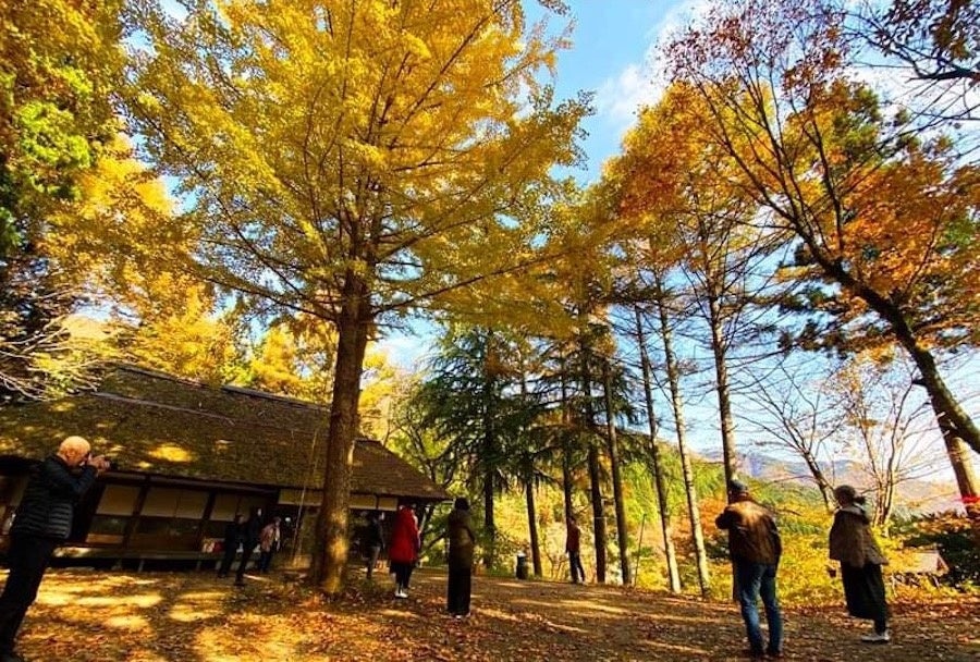⼭梨県道志村の美しい紅葉の養老の森の雫カフェ共催による千⼿桜舞台にて、能楽師 観世流シテ⽅ 武⽥宗典師による能楽とお茶会