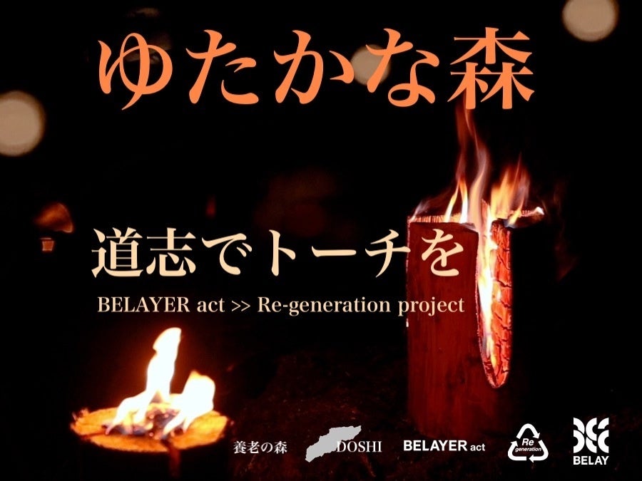 BELAY株式会社では、現在、⾃社のサスティナブルプラットフォーム「BELAYER act」の活動として〝森の整備が⽔をきれいにする〟をテーマにゆたかな森を育む間伐などの森林整備活動、きれいな⽔の象徴でもある「わさび⽥再⽣プロジェクト」という2つの活動を道志村で⾏っています。こうした活動のつながりから今回、「森と⼈を和⽂化で繋ぐツナグの森project」の阿部朱華羅氏よりお声がけいただき⽇本の伝統芸能「能」と養⽼の森の間伐材の「スウェーデントーチ」の灯⽕コラボが実現することとなりました。