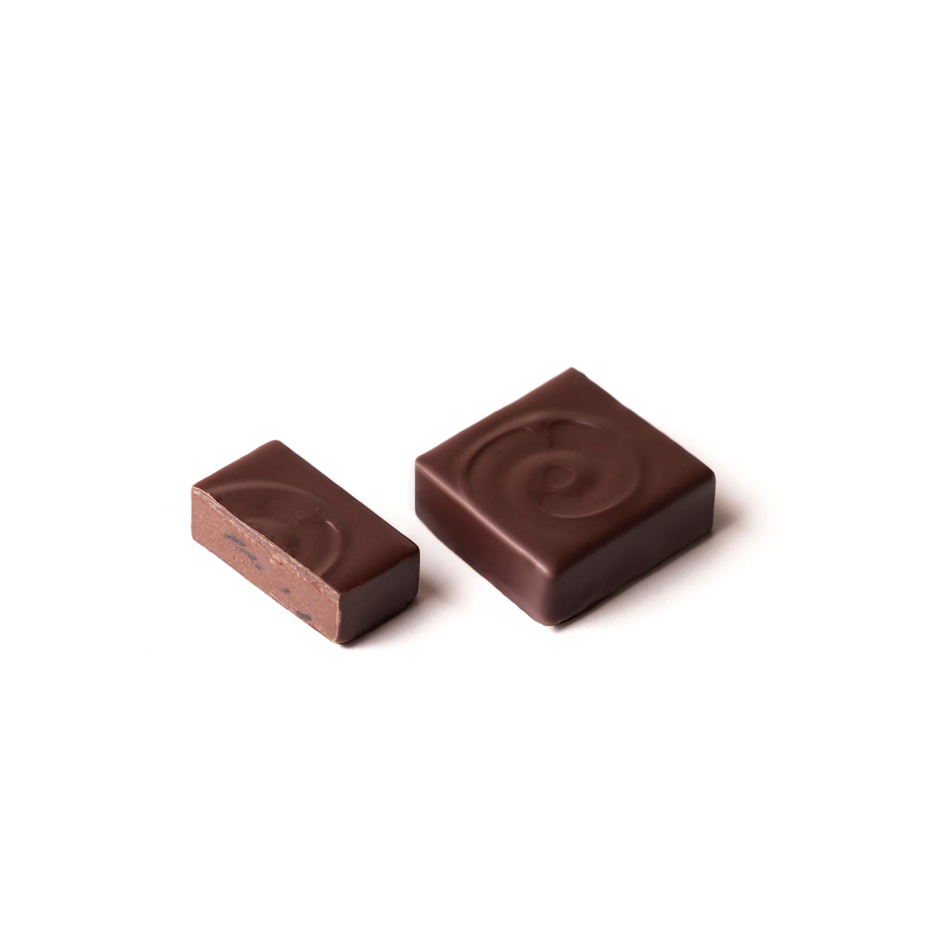 まろやかな甘みと旨味のあるフランス・ブルター ニュ地方のゲランド塩を利かせたカカオの力強さを感じるビターガナッシュ。粗刻みのブラックオリーブを混ぜ込み、食感のアクセントに。ほのかな塩味とショコラの苦みがオリーブの味わいを引き立て、SUBRINAをよりまろやかに感じさせてくれます。渦潮をイメージしたデコールで。