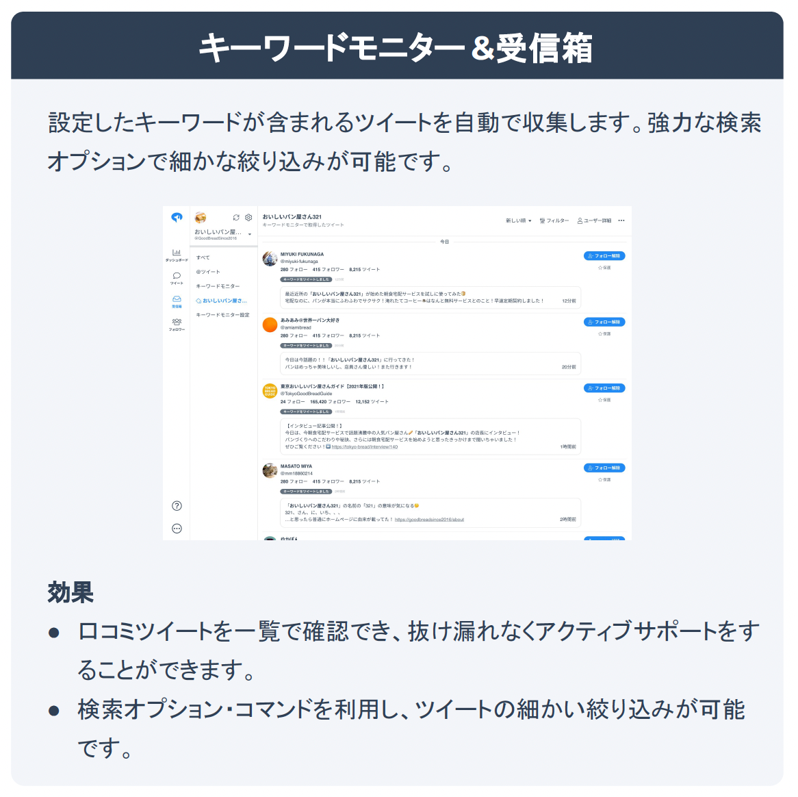 キーワードを設定することで関連するツイートを収集できる機能(キーワードモニター)があり、自社の口コミを抜け漏れなく確認できます。また、炎上の可能性や予期せぬ拡散などもいち早く察知することができます。過去のツイートで評判の良かったものを効率よく検索できるため、今後の成功へとつなげることができます。予約投稿やリツイートキャンペーンの抽選機能など、各アカウントの強みを活かす機能で「中の人」の多忙な業務を強力にサポートしています。