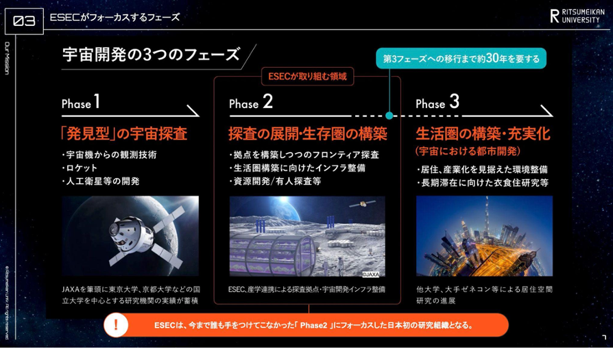 立命館大学では昨年7月1日に、月・惑星における人類の生存圏拡張と、探査拠点となる宇宙開発・インフラ構築に取り組む日本初の研究組織としてESECを、立命館大学宇宙地球探査研究センター(ESEC)を設置しました。