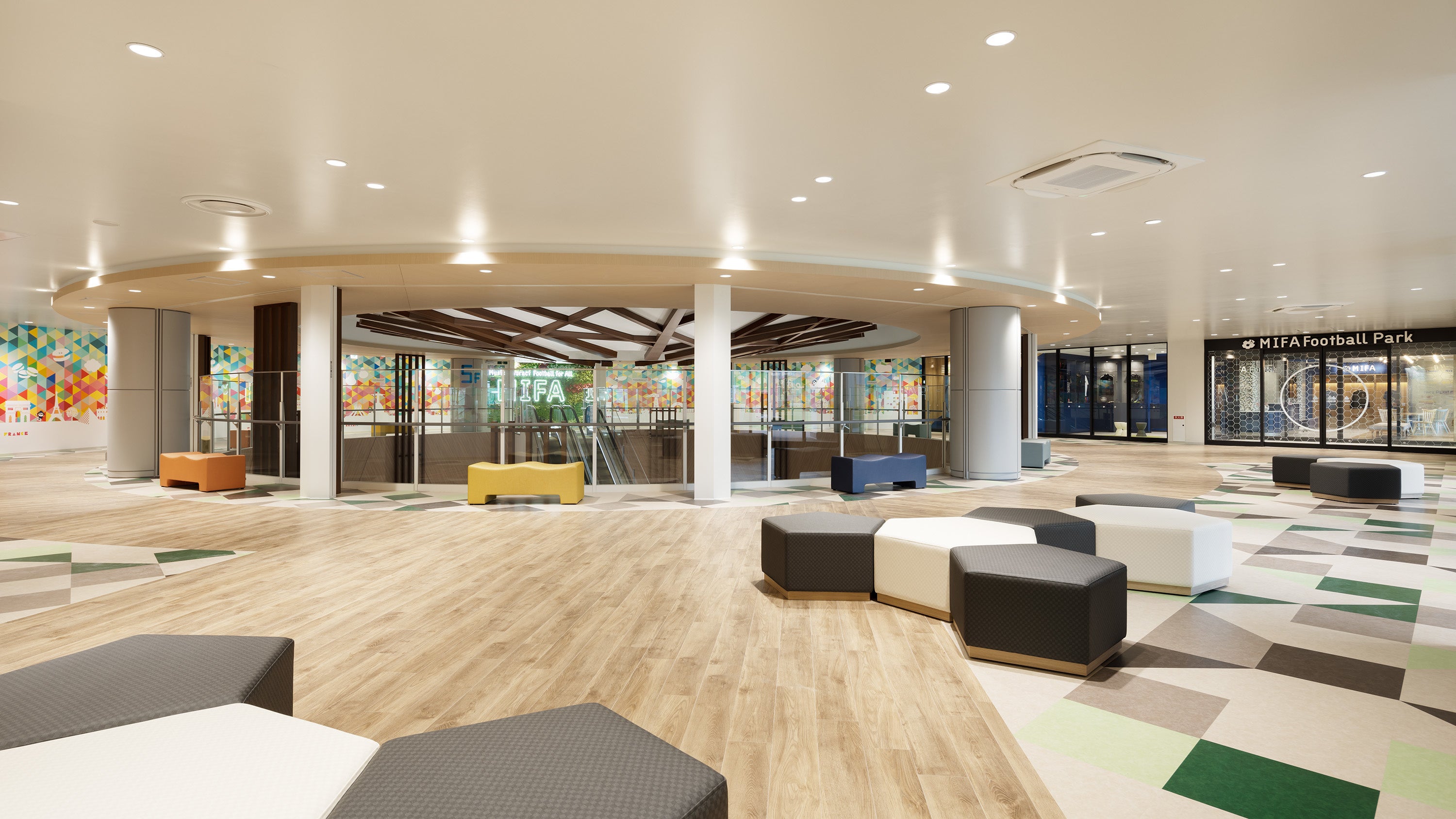 ヘキサゴンをモチーフとしたグラフィック・サイン計画により、「MIFA Football Park福岡」の世界観を施設全体で表現しています。共用部分からパーク入口までのアプローチ空間は、これまでの「MIFA Football Park」の歴史や、アジアの玄関口でもある福岡の特徴をあらわすべく世界各地をモチーフとしたグラフィックを展開しています。