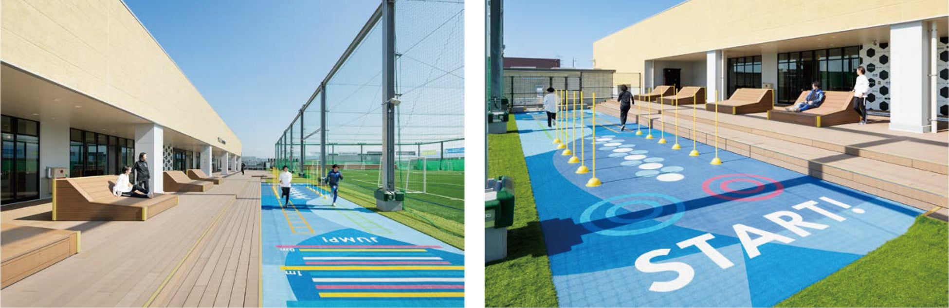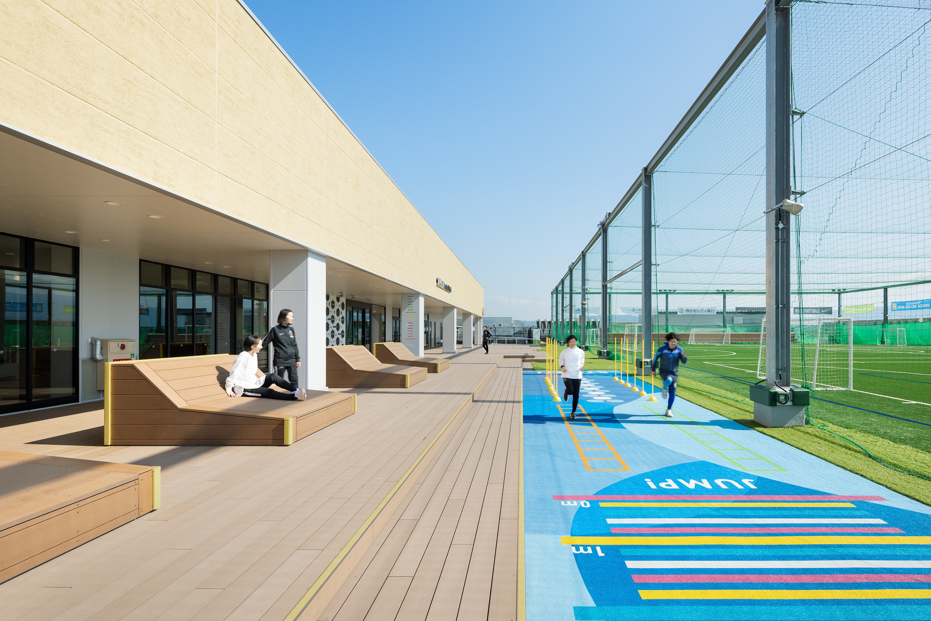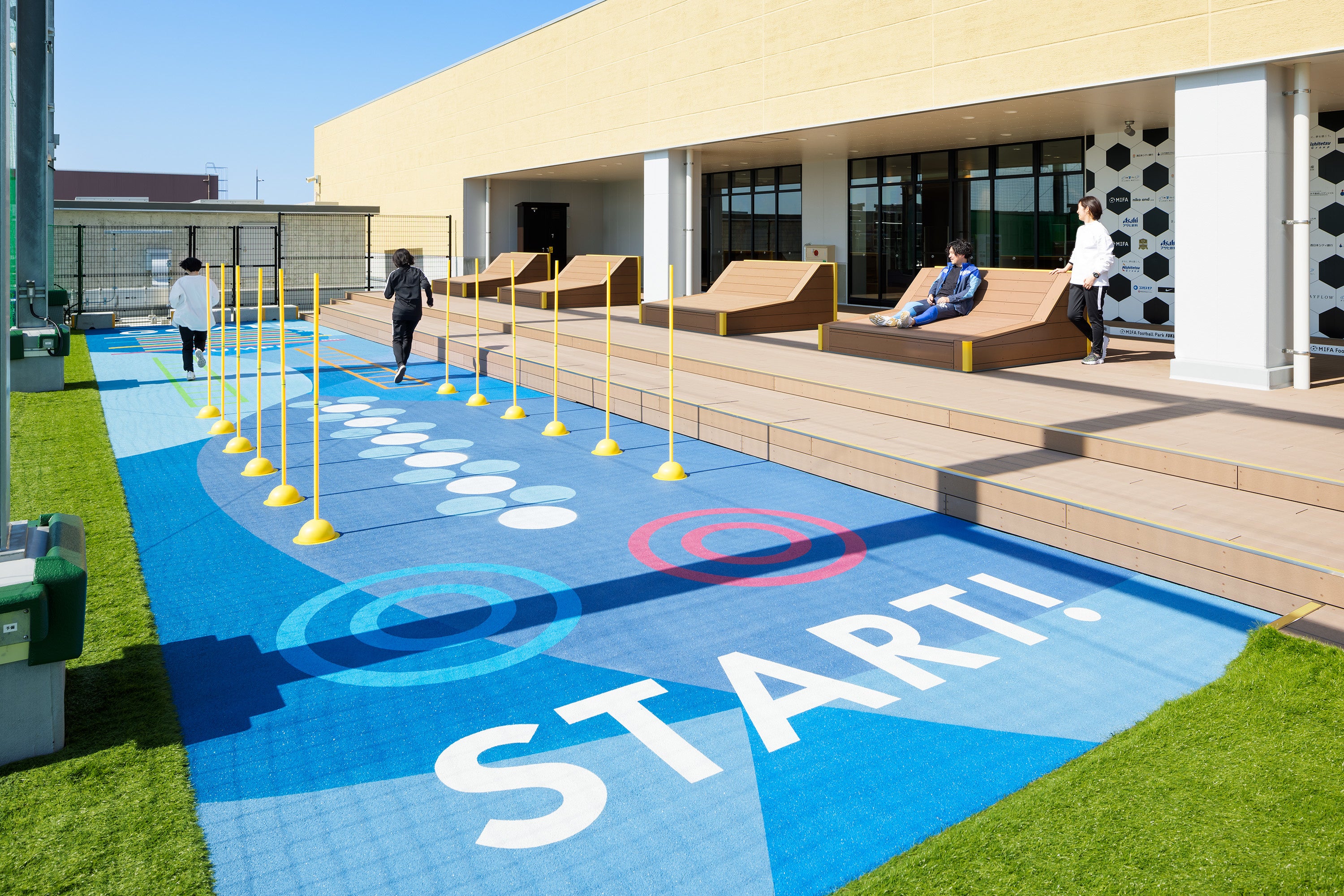 フットサルコート内でのプレーだけでなくトレーニングも出来るスペースとして、コートサイドにアジリティトレーニング*用のオープンスペースを設けました。床面に施したグラフィックが目印となり、おとなも子どもも楽しくトレーニングできます。またリラックスしながらフットサルを観戦できるデッキエリアも設けました。*アジリティトレーニング:敏捷性を高めるために行われるトレーニングのこと