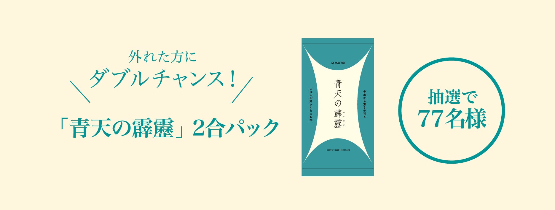 クイズ正解者の中から抽選で77名様に「青天の霹靂2kg+オリジナルトートバッグ+オリジナルエプロン」のセットを。さらにダブルチャンスとして77名様に「青天の霹靂2合パック」をプレゼント。