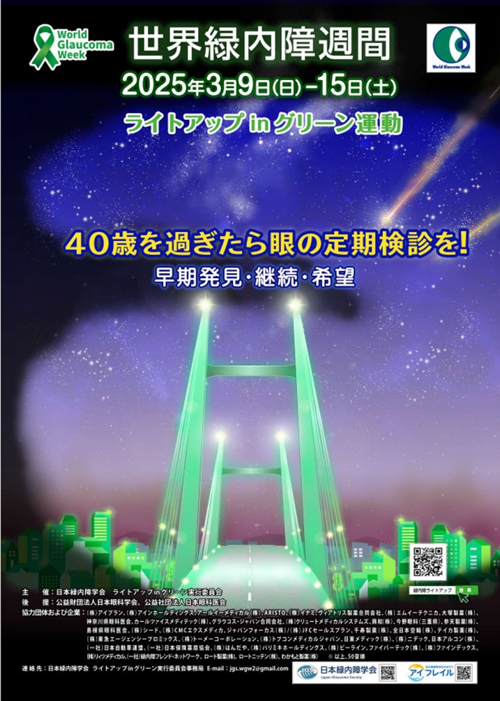 日本緑内障学会では、緑内障の認知と啓発に向けて、各地のランドマークや医療施設等をグリーンにライトアップする「ライトアップinグリーン運動」を、世界緑内障週間(2025年3月9日~15日)に合わせて展開いたします。