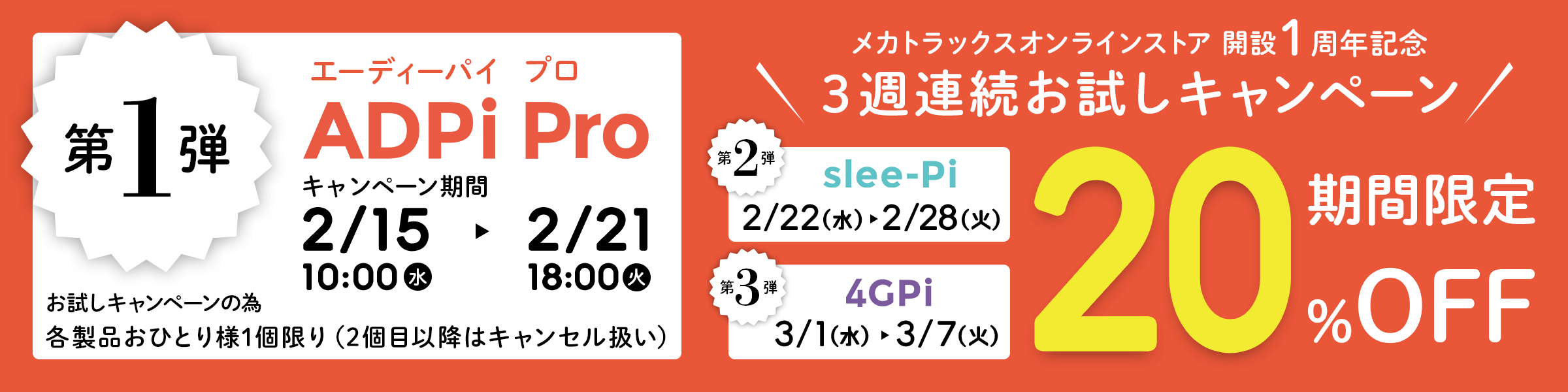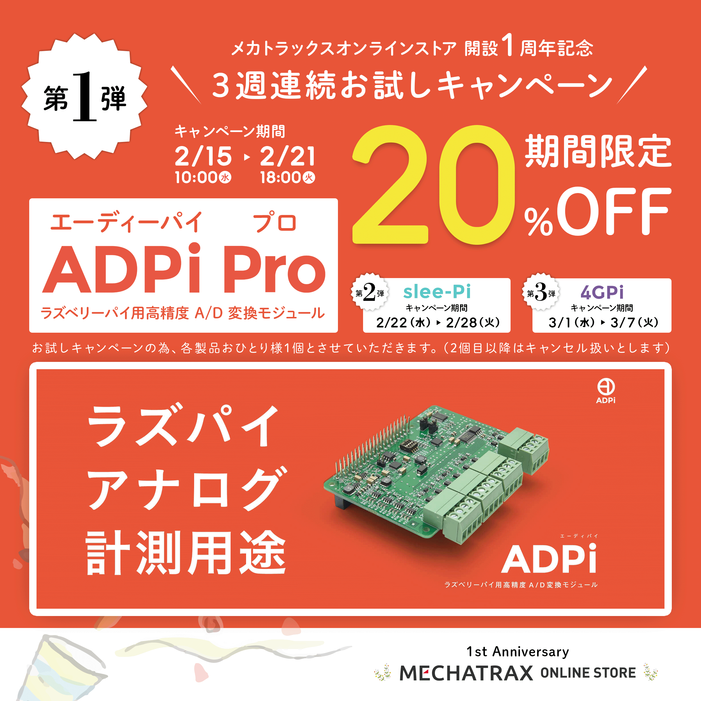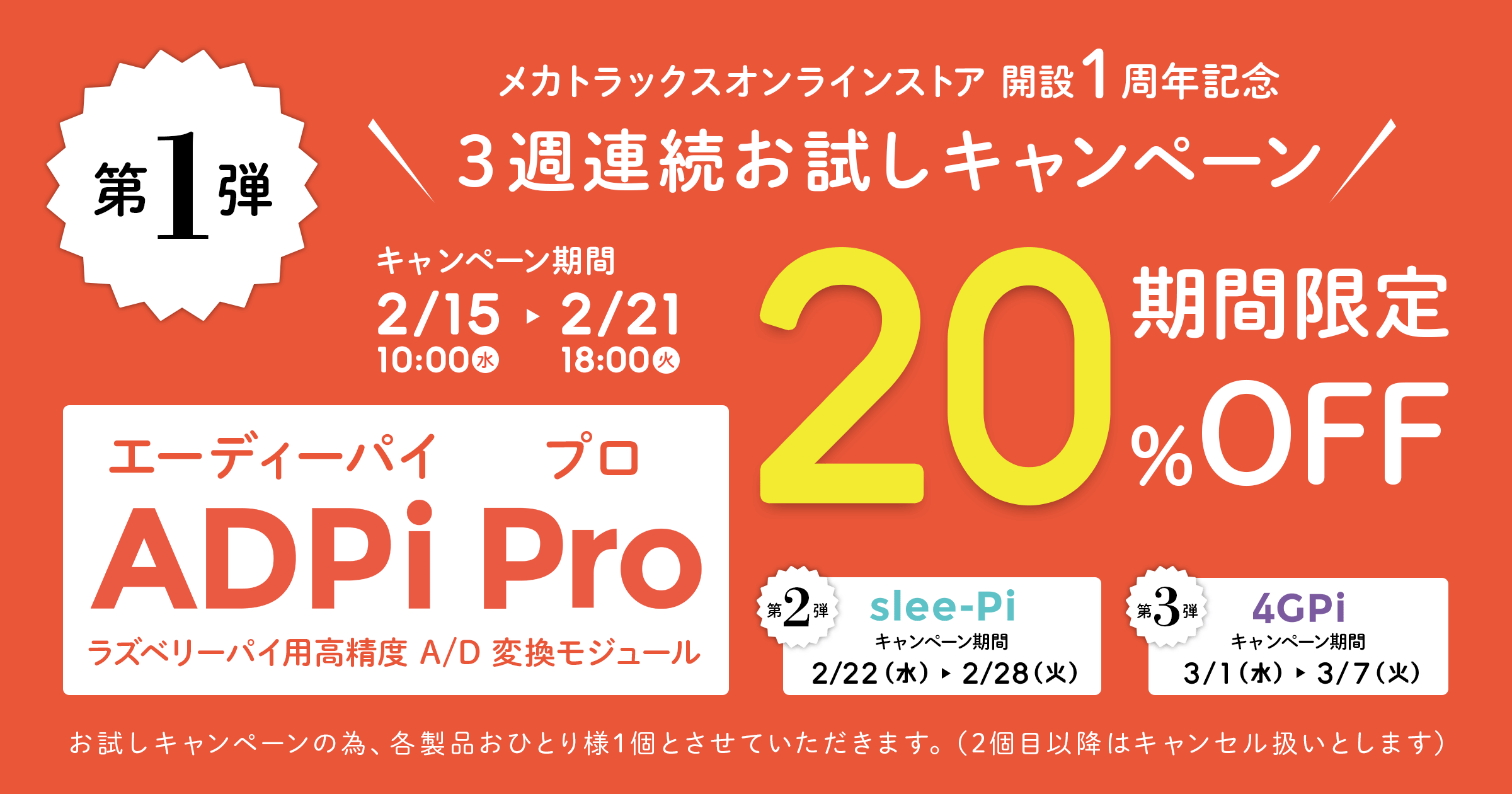 メカトラックスオンラインストアは、2月15日から3週にわたり弊社ラズベリーパイ用高精度A/D変換モジュール「ADPi Pro」、同電源管理/死活監視モジュール「slee-Pi 3」、同4G(LTE)通信モジュール「4GPi」を 20%OFF で提供するキャンペーンを開始します。併せて、Twitterフォロー&リツイート特典(抽選で各製品1個をプレゼント)も実施!