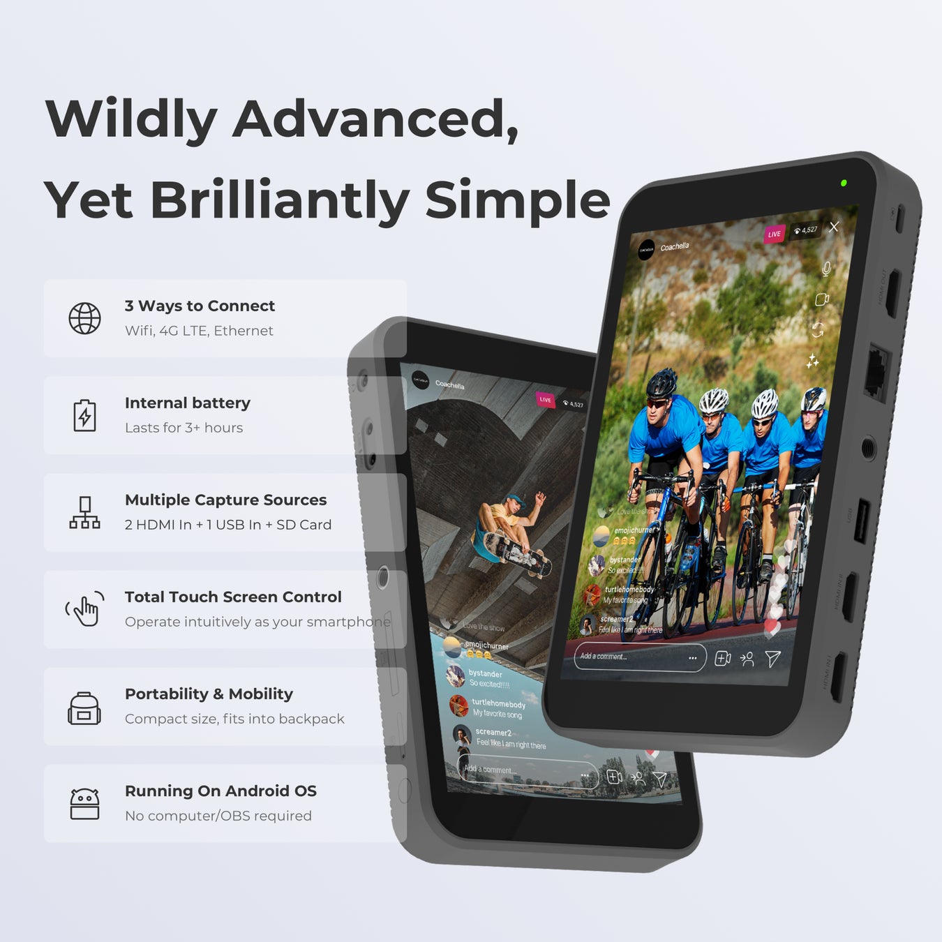 ライブ配信に必要な「エンコーダー」、映像を切り替える「スイッチャー」、映像を確認する「モニター」、映像を記録する「レコーダー」を1台に集約した縦型配信向けライブストリーミングデバイス