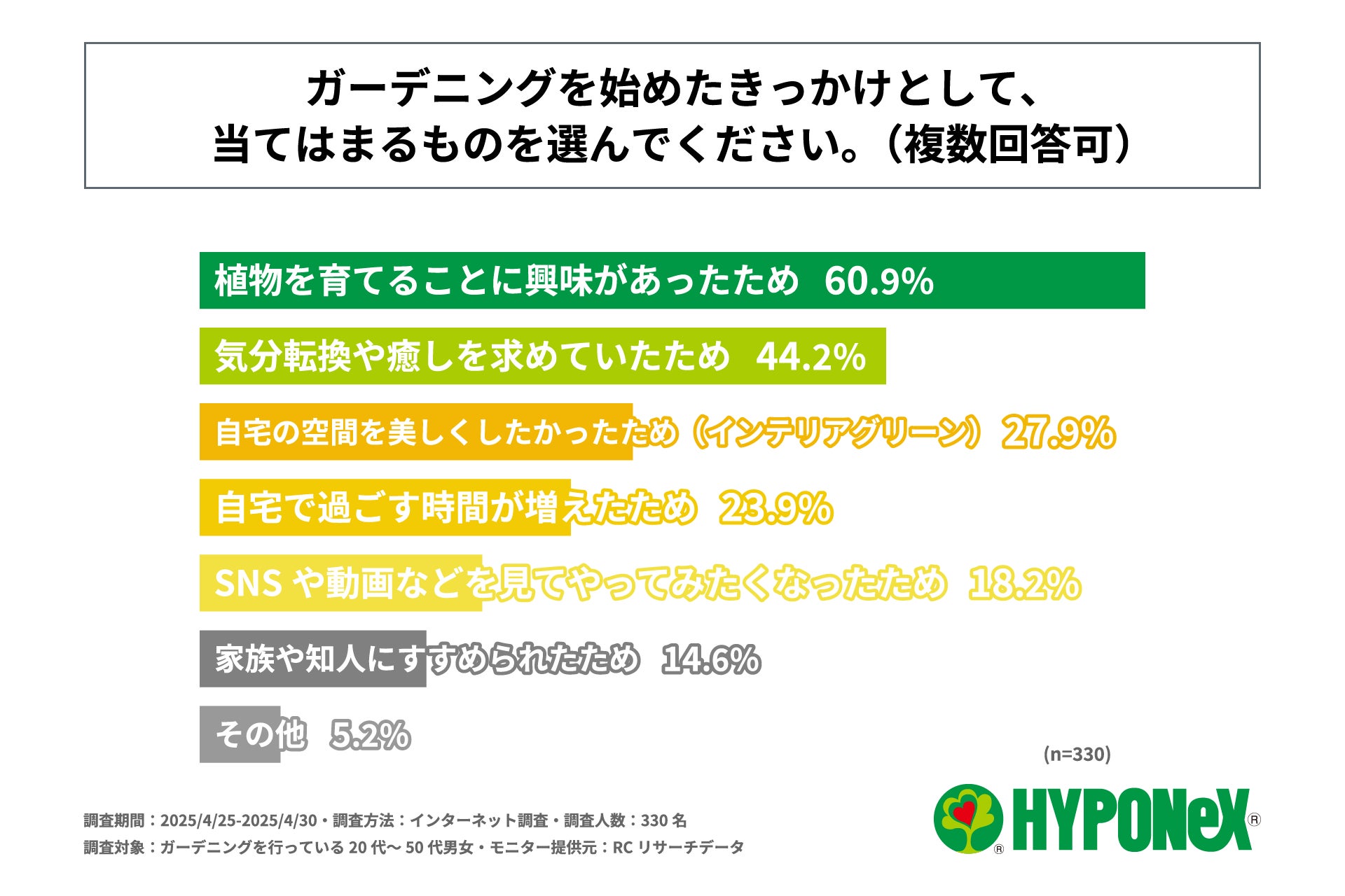 まず、「ガーデニングを始めたきっかけ」を尋ねる設問への回答では、1位が「植物を育てることに興味があったため」で60.9%、2位が「気分転換や癒しを求めていたため」で44.2%、3位が「自宅の空間を美しくしたかったため(インテリアグリーン)」で27.9%という結果になりました。この結果から、ガーデニングを始めた主なきっかけは、「植物を育てることに興味があったため」や「気分転換や癒しを求めていたため」であることが明らかになりました。