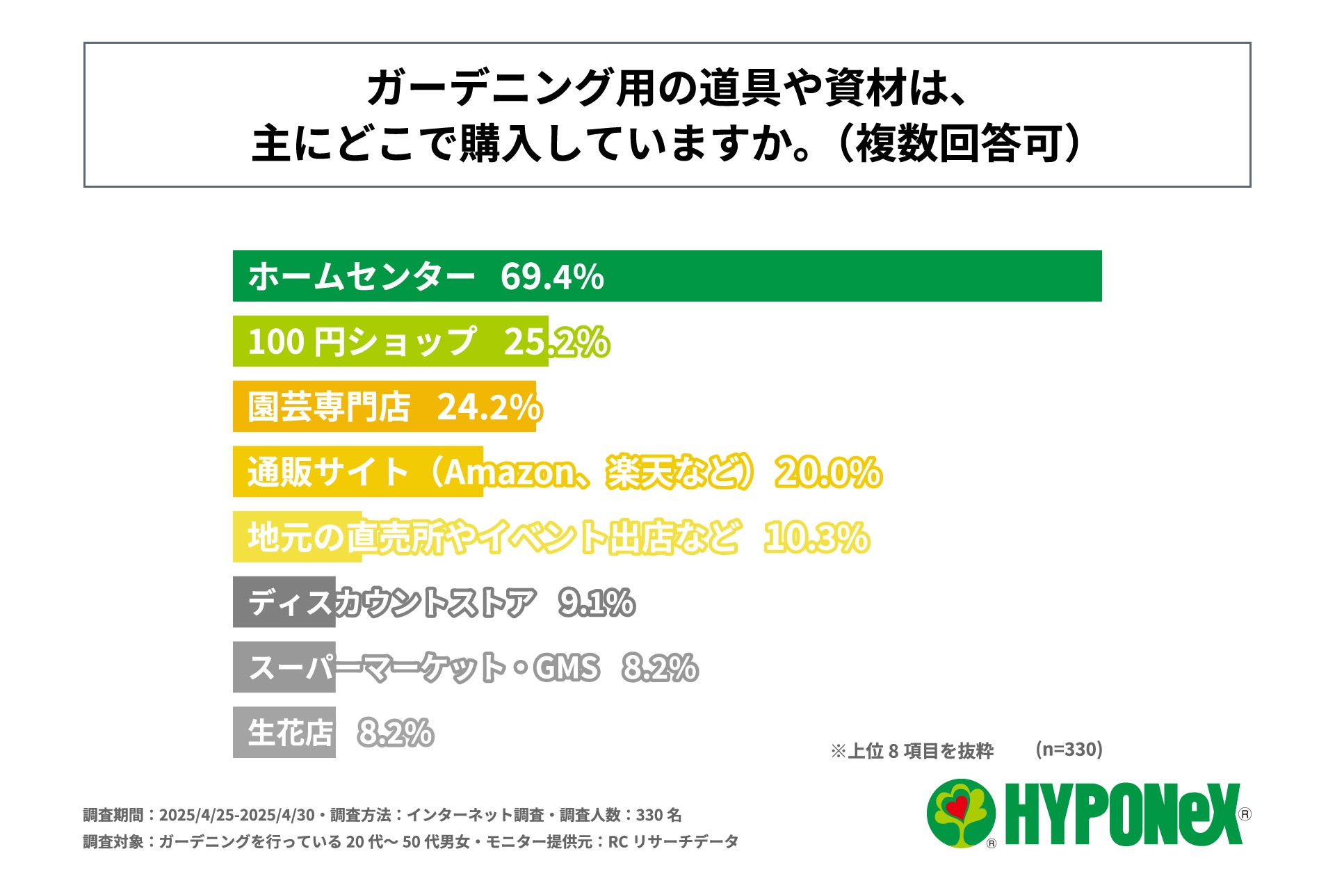 また、「ガーデニング用の道具や資材は、主にどこで購入しているか」を尋ねる設問への回答では、1位が「ホームセンター」で69.4%、2位が「100円ショップ」で25.2%、3位が「園芸専門店」で24.2%という結果になりました。この結果から、ガーデニング用の道具や資材の購入場所としては「ホームセンター」が最も多いことが明らかになりました。