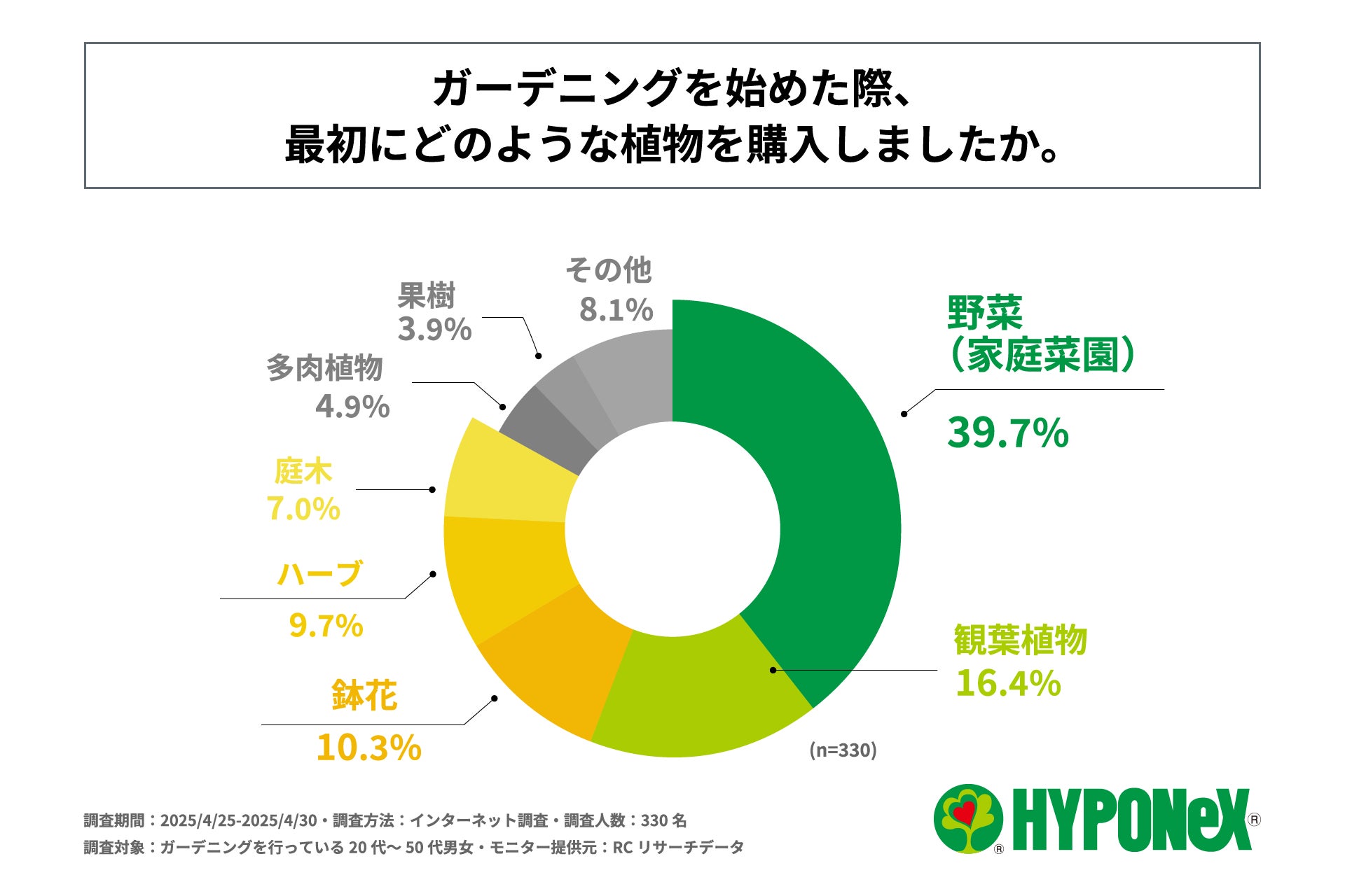次に、「ガーデニングを始めた際、最初にどのような植物を購入した」を尋ねる設問への回答では、1位が「野菜(家庭菜園)」で39.7%、2位が「観葉植物」で16.4%、3位が「鉢花」で10.3%という結果になりました。この結果から、ガーデニングを始めた際、最初に購入した植物は、「野菜(家庭菜園)」が最も多いことがわかりました。