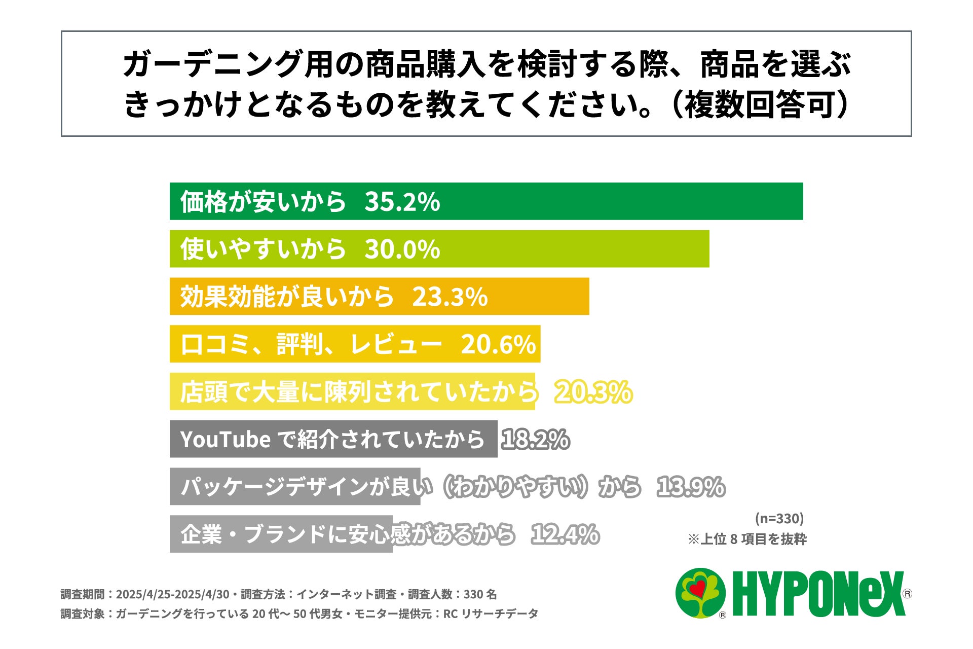 調査の最後、「ガーデニング用の商品購入を検討する際、商品を選ぶきっかけとなるもの」を尋ねる設問への回答では、1位が「価格が安いから」で35.2%、2位が「使いやすいから」で30.0%、3位が「効果効能が良いから」で23.3%という結果になりました。4位以降も10%以上の回答率が複数並ぶことから、ガーデニング用の商品購入を検討する際、商品を選ぶきっかけとなるものは多岐に渡るということがわかりました。